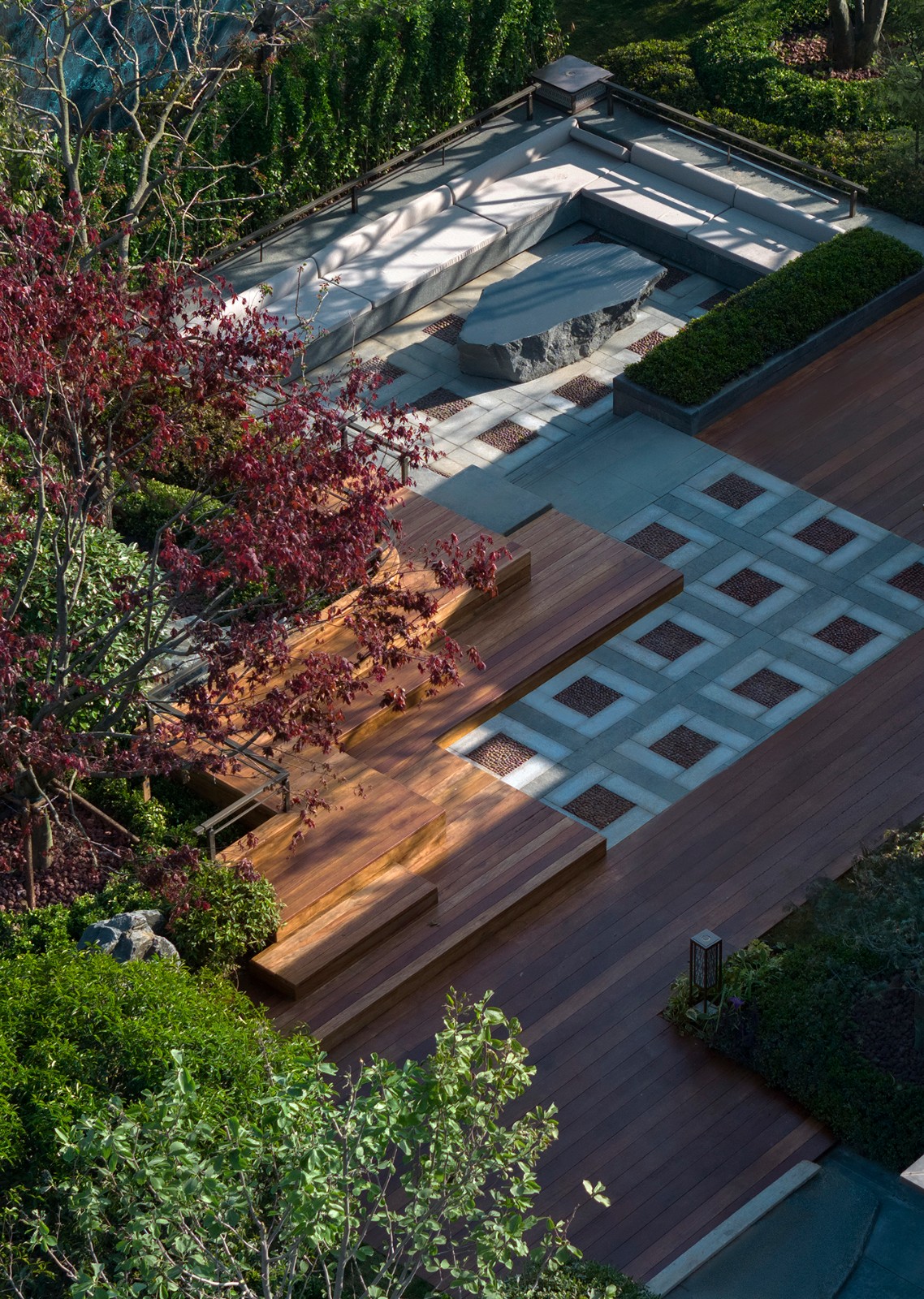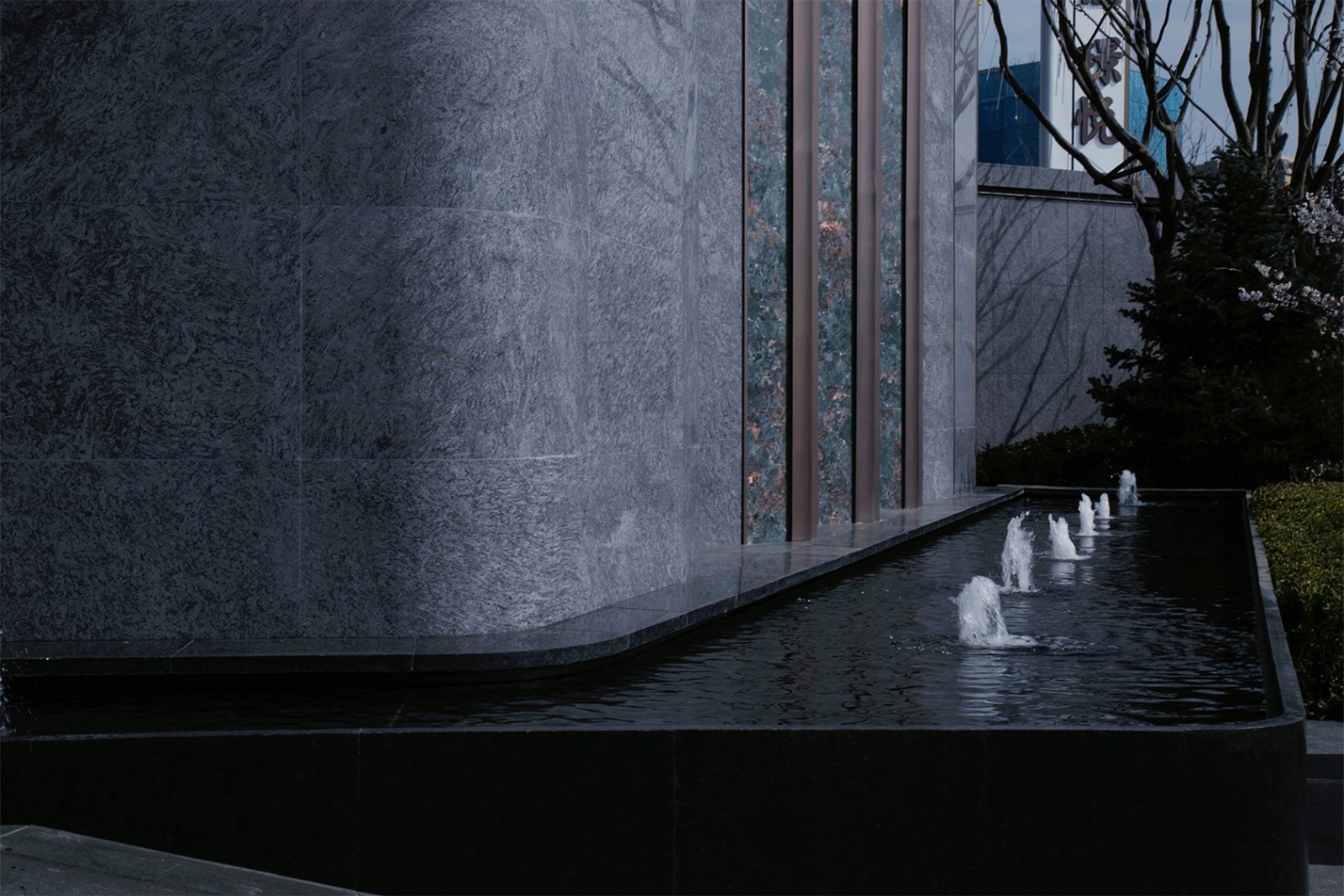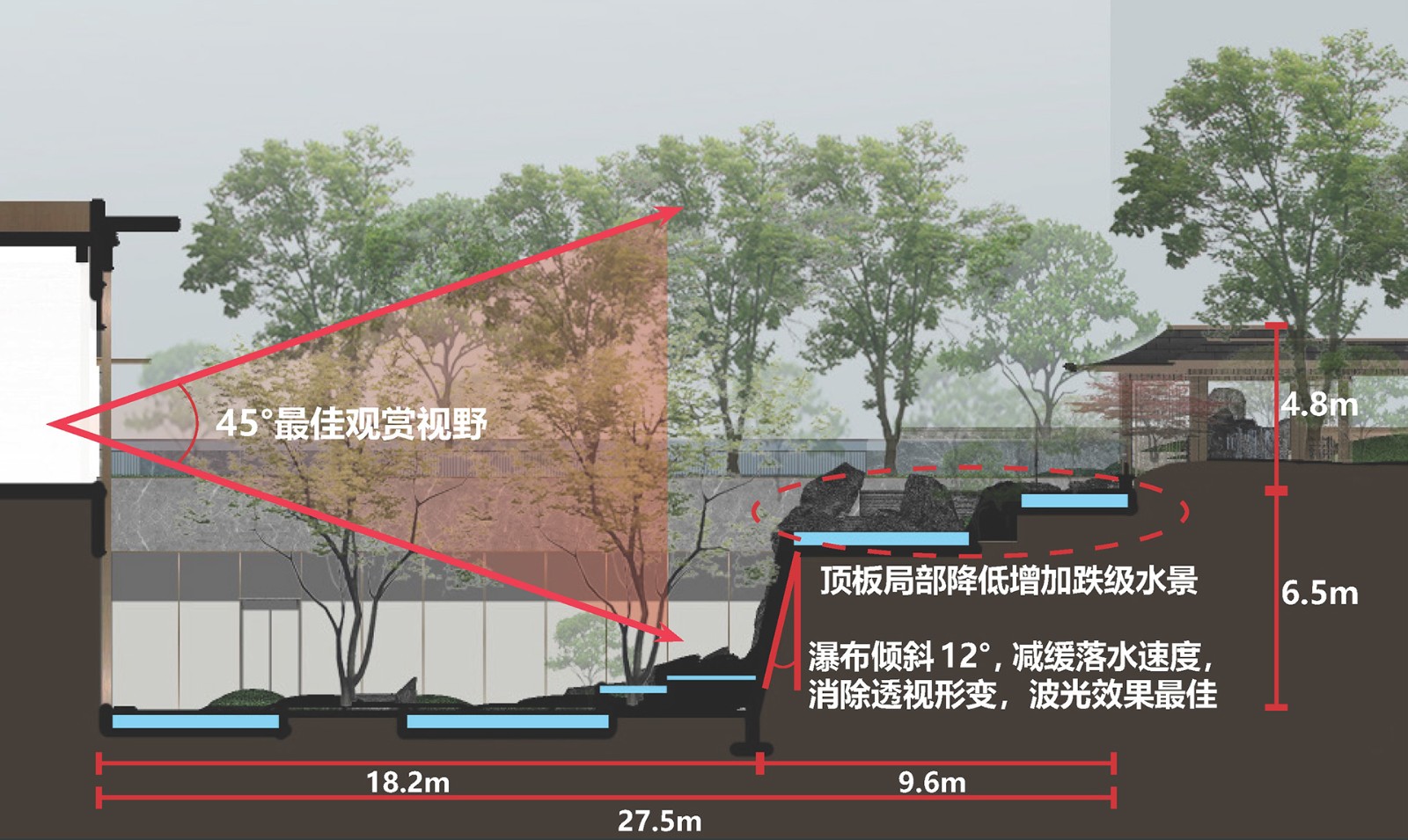 通過利用下沉庭院巨大的豎向高差,打造多層次景觀空間,營造生動形態(tài)的三層退臺。初入印象為流泉疊瀑,以石為山,以流水為川,寬幅流水石屏化解高差帶來的壓迫感。