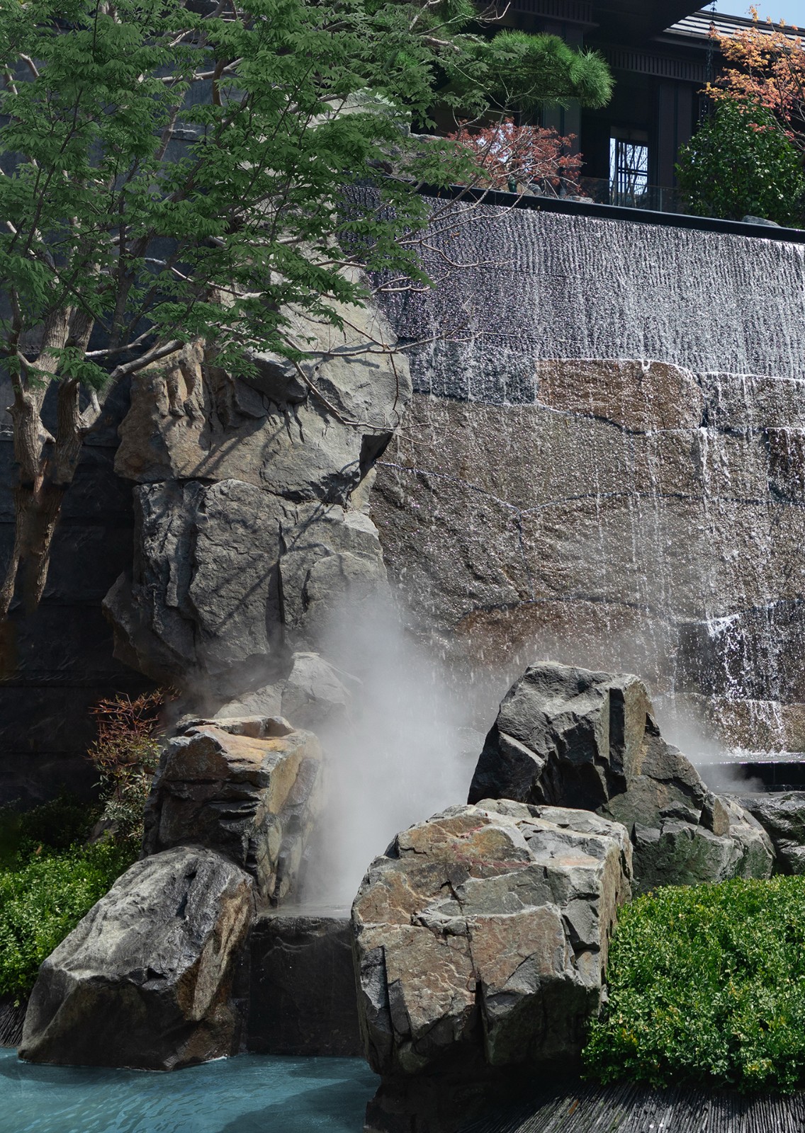在260㎡下沉庭院中,取嶗山名景“九水觀瀑”實景,演繹寬10M流水瀑布,串聯(lián)上下兩層水院,從潺潺水聲的會客廳,到水墨意境的山石瀑,再到綠島掩映的靜水潭,不管在大堂或是負一層會所都能看到一幅完整的山水畫卷。