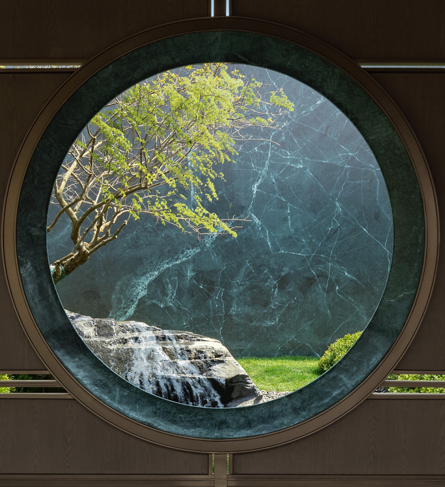 紫薇、蒼石通過月洞門入畫,雙面觀進口天然高檔石材大花綠玉璧。