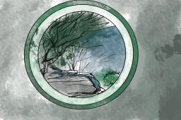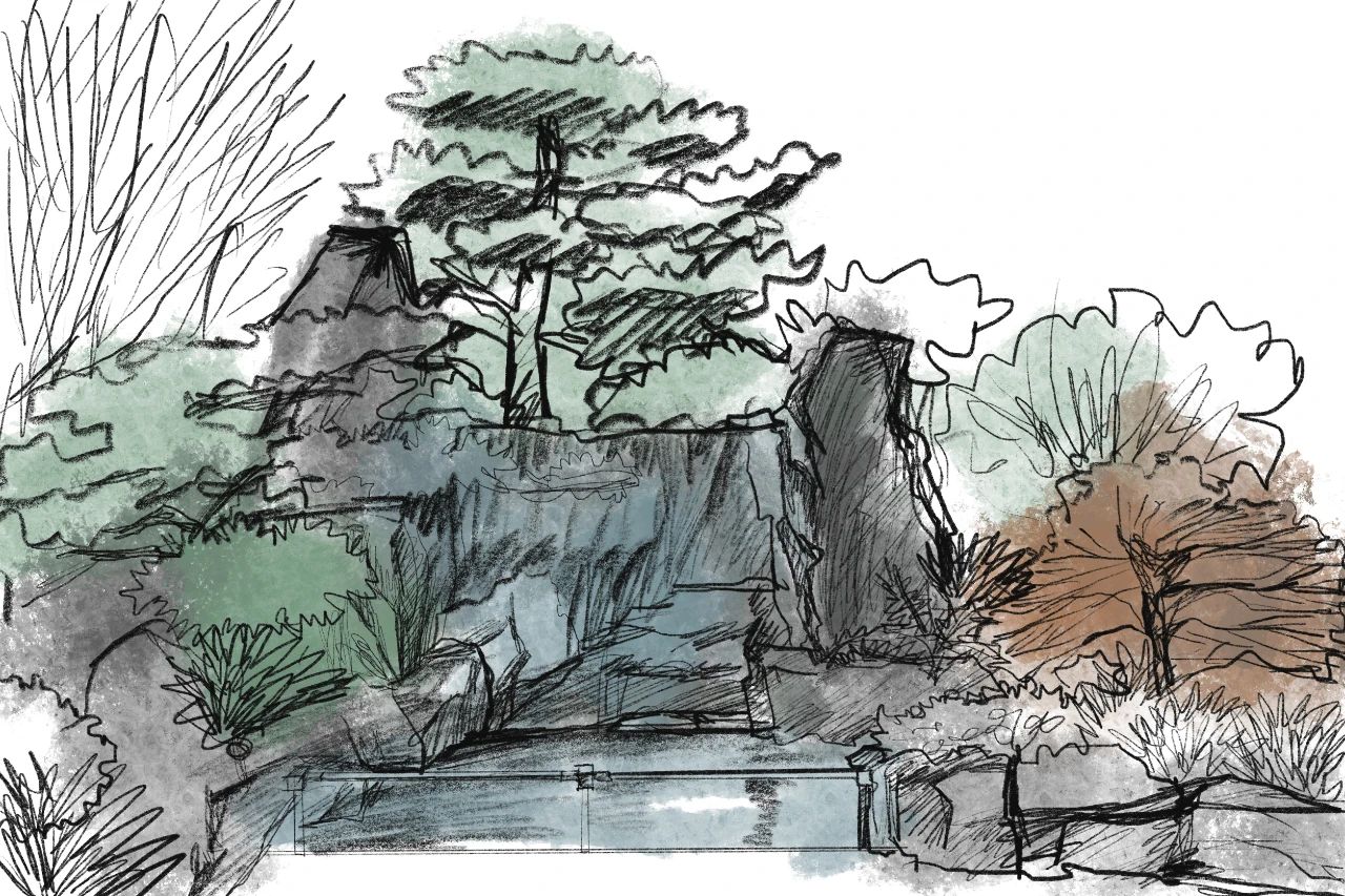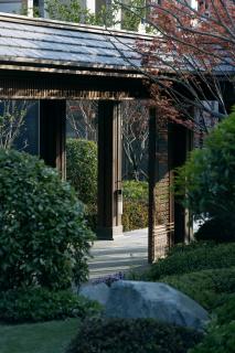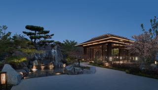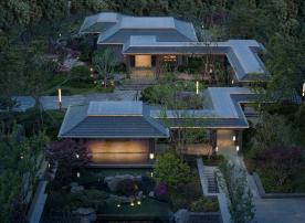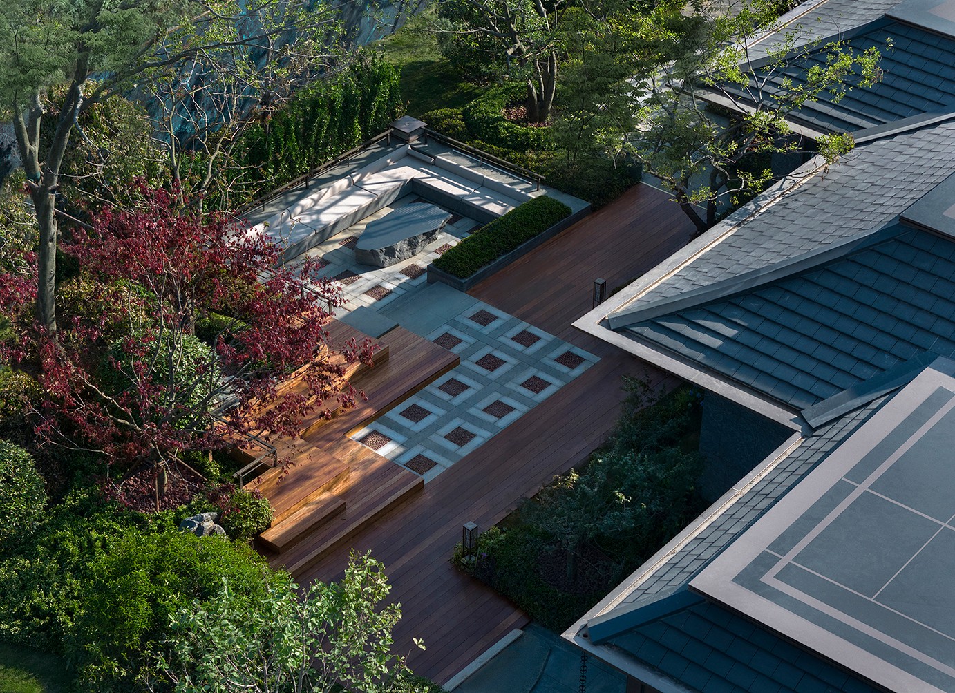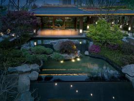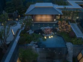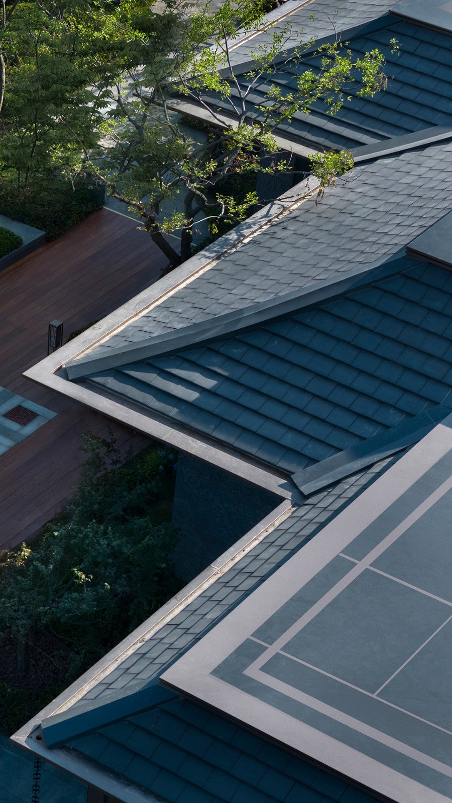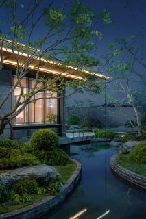 視線仰望,以浮潭茶室為視線終點,在空間上使人望去,不覺一覽無余;下沉的青丘之境,引入自然原生的肌理,全冠移植的烏桕與水景交相輝映,自然石穿插其中,用火山片巖壘砌而成的蜿蜒溪流,營造出曲徑通幽谷的自然感受。