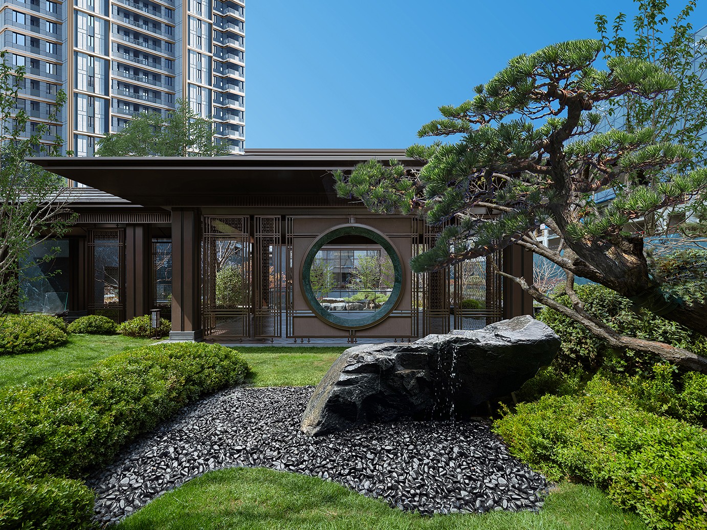 設計以游園中院,品璞玉臻璟為主題,取形于拙政園借鑒傳統(tǒng)造園手法,賦予時尚的表達形式,融入精致的雅奢元素。整體以穩(wěn)重、內(nèi)斂為風格傾向,強調(diào)材料的品質及質感,打造一軸,三進,一環(huán)高端奢宅景觀。