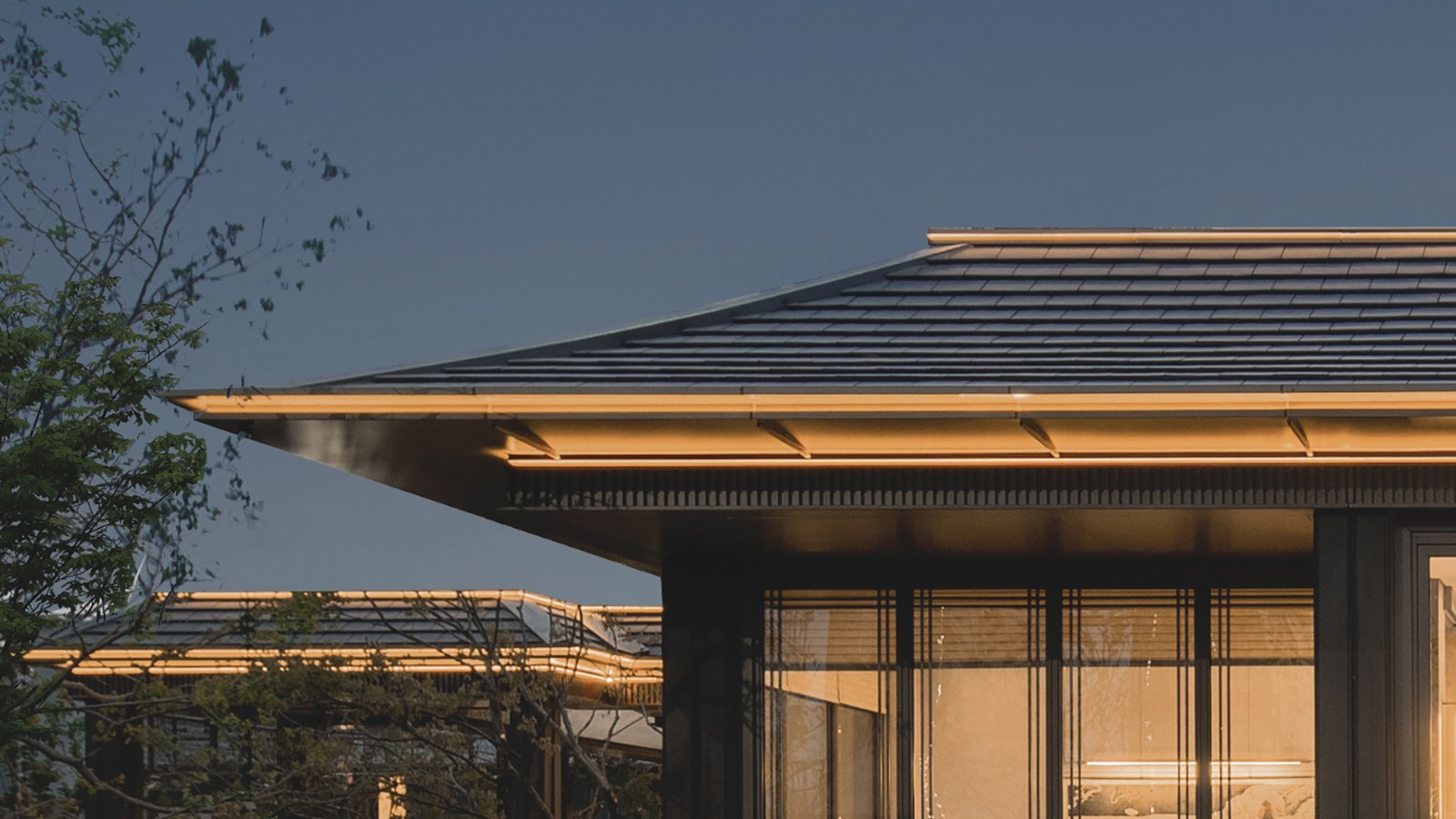 浮潭茶庭融合現(xiàn)代審美與東方意蘊,巧妙拓茶空間的維度。茶亭采用懸浮式的梯形吊頂,屋頂形式參考古典園林建筑坡屋頂形式。