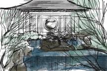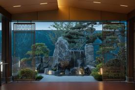 流水會客廳漂浮于瀑布之上,正如“江山無限景,乾坤一草亭”那般,方圓天地,小橋流水,聽風賞瀑,坐庭觀景,由小見大,在此會客知音,暢享內(nèi)心天地。
