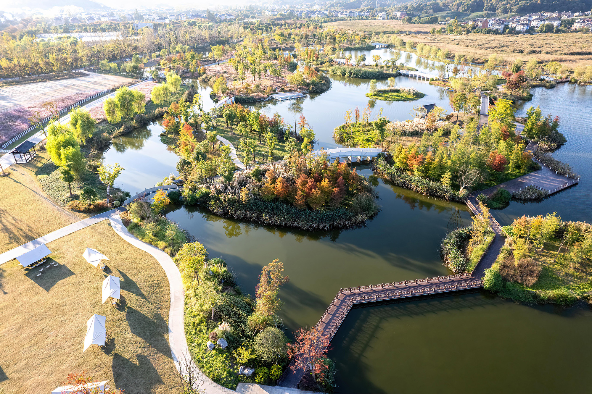 The design team drew upon the site's natural elements - lakes, mountains, fields, tea, and grass - to rebuild the blue-green infrastructure and restore habitats. By integrating wetlands, islands, revetments, and gentle slopes, they fostered diverse ecological communities, enhancing species biodiversity.