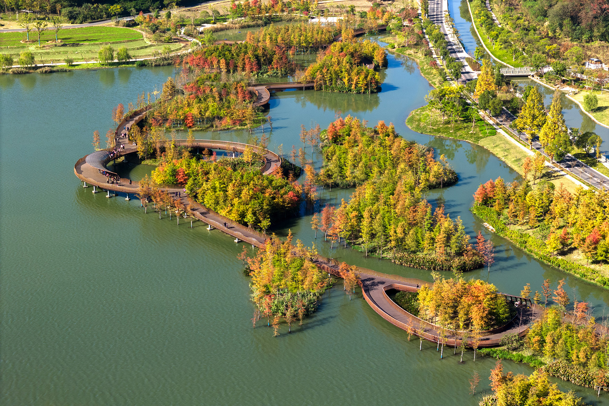 The design team designed biomimetic island shapes, encapsulating varying lake surfaces, streams, and wetland archipelagos, fostering diverse lakeside experiences.