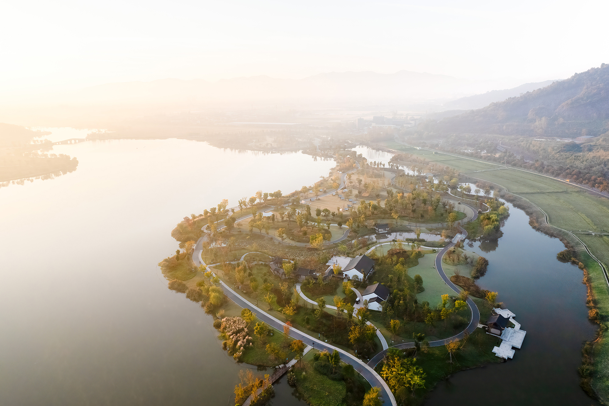 設(shè)計團隊以場地的湖、山、田、茶、草為生態(tài)基底,重塑藍綠基底、修復(fù)生境。結(jié)合濕地、島嶼、駁岸、緩坡等地形營造生境群落,構(gòu)建物種多樣性。通過文化遺產(chǎn)評估方法來識別和梳理現(xiàn)存遺址,確定保護區(qū)域;將歷史記憶融入古湖埠碼頭等景觀節(jié)點,以最大限度地利用自然,并展示該地的歷史。在設(shè)計過程中,植入產(chǎn)業(yè)開發(fā),融入了徒步、游船、登山、露營、人文科普等多重體驗游線,以生態(tài)水利帶動周邊區(qū)域經(jīng)濟發(fā)展。