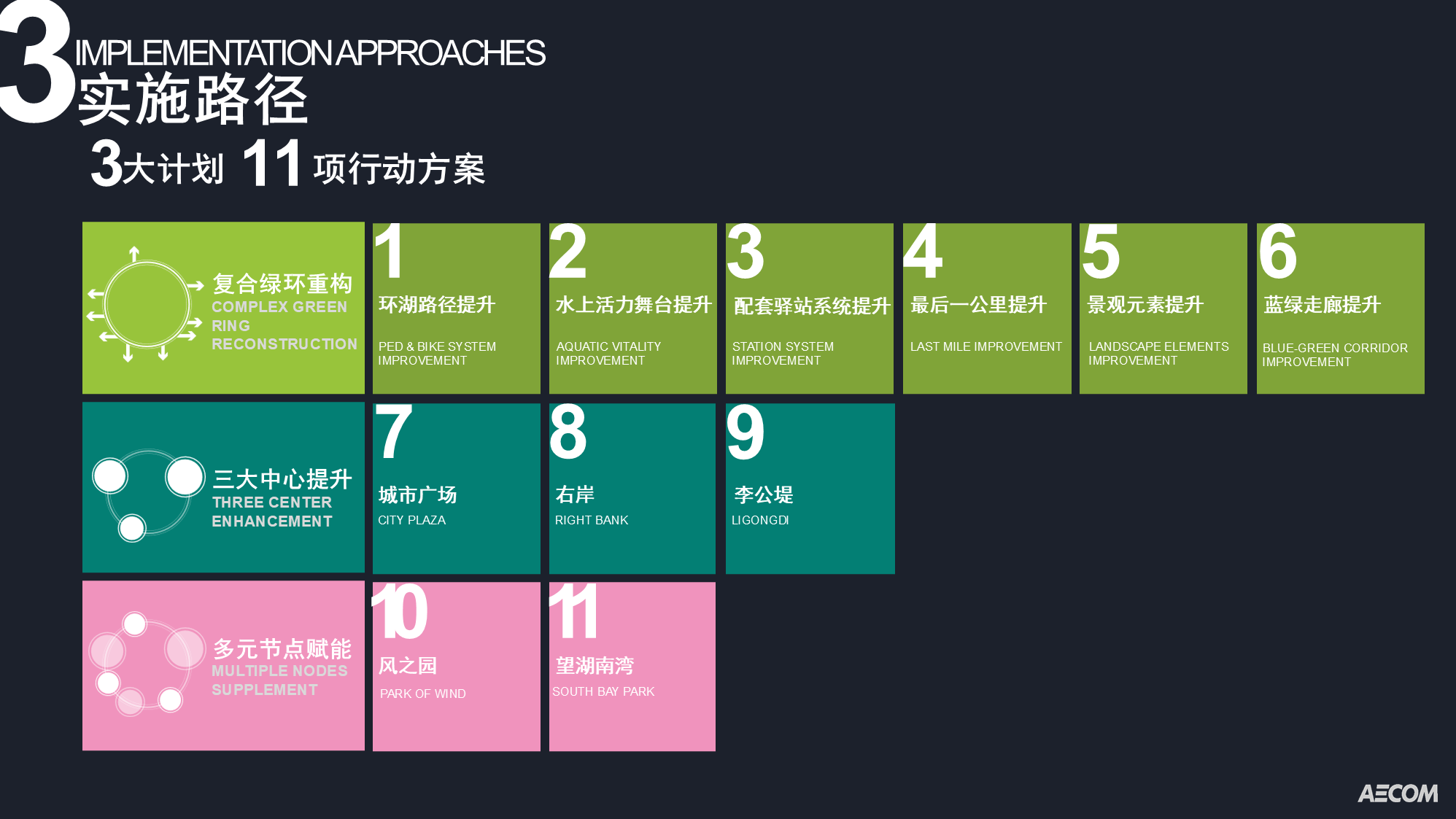 基于創(chuàng)新的治理模式,并依托于AECOM的ESG理念,我們?yōu)榻痣u湖環(huán)湖公共空間的升級(jí)提出了“為人營(yíng)境的全時(shí)經(jīng)濟(jì)”的頂層目標(biāo)。設(shè)計(jì)以“使用者導(dǎo)向的慢行低碳場(chǎng)所”為策略,對(duì)復(fù)合綠環(huán)進(jìn)行了重構(gòu);借助“傳承蘇州基因的旅游目的地”策略,實(shí)現(xiàn)三大中心的提升;并通過(guò)“最具歸屬感的友好濱水空間”策略,對(duì)多元節(jié)點(diǎn)賦能。在這三大計(jì)劃的指導(dǎo)下,我們明確了11項(xiàng)具體的行動(dòng)方案,以確保環(huán)金雞湖公共空間的長(zhǎng)遠(yuǎn)發(fā)展和系列項(xiàng)目的有效實(shí)施。