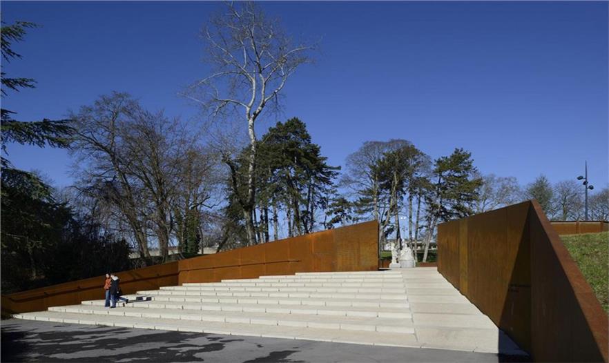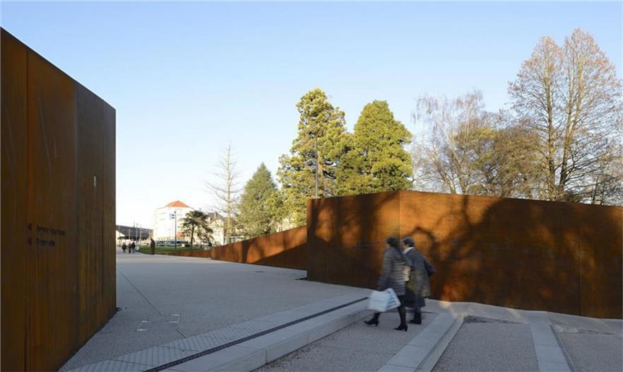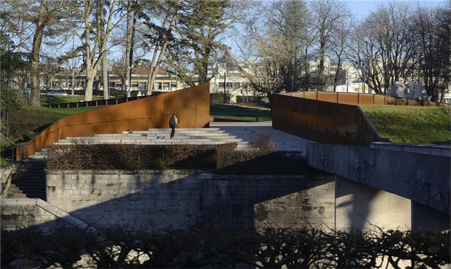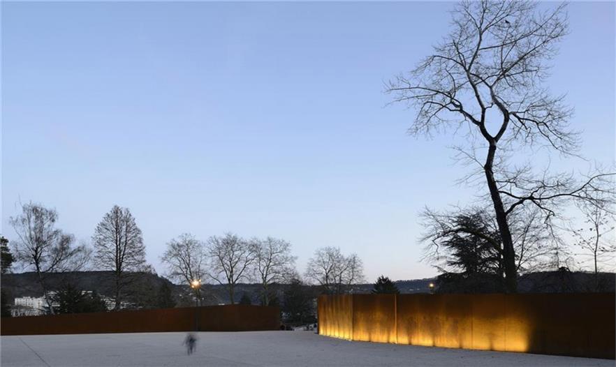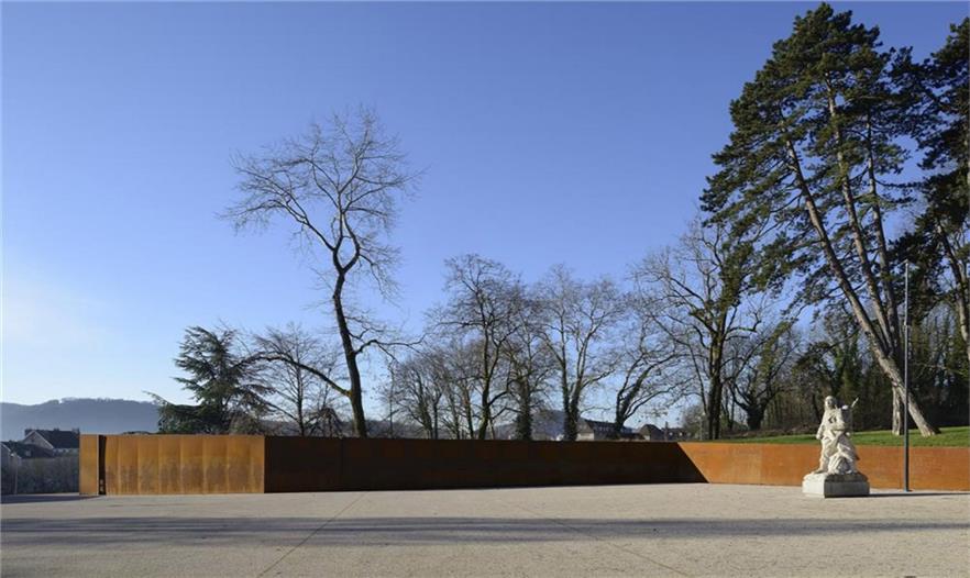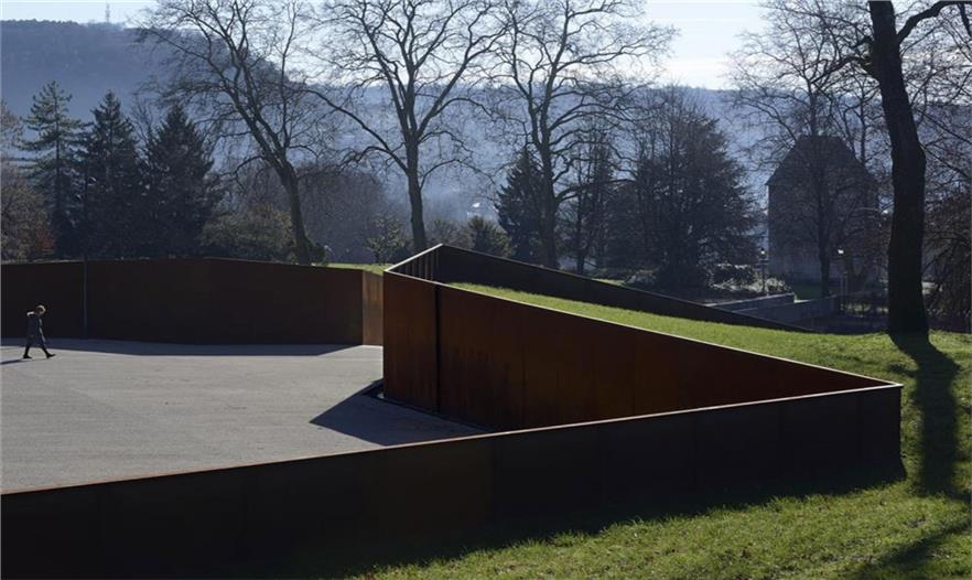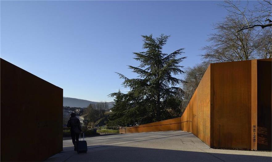 在Parc des Glacis核心地帶,曾是一座沃邦(Vauban)防御工事用的堡壘,這個紀(jì)念性的場地由耐候鋼壁環(huán)繞包圍,鋼壁像戰(zhàn)壕一樣分割場地,并且顯示著地形的變化。