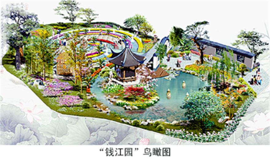 第六屆中國花卉博覽會浙江展區(qū)室外景觀區(qū)--“錢江園”形狀近似矩形,占地約1419平方米。該園設(shè)計構(gòu)思將景區(qū)分為古、今兩個景觀分區(qū)。