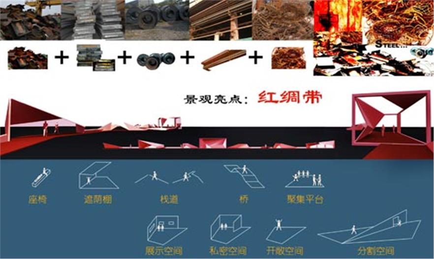 此方案的設計特色為“一條藍帶串起的四種文明”。其中,“藍帶”為三帶一區(qū)、三場九園、步道網(wǎng)絡形成的總體結構;“四種文明”為“灘”的回歸、五谷禾田、工業(yè)遺存、后工業(yè)生態(tài)文化。