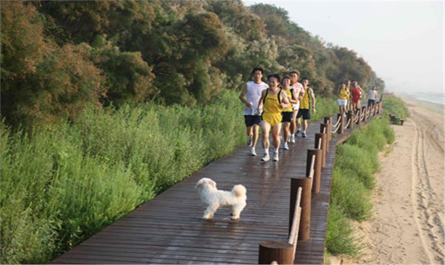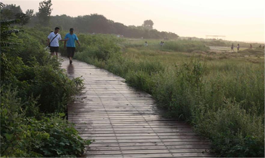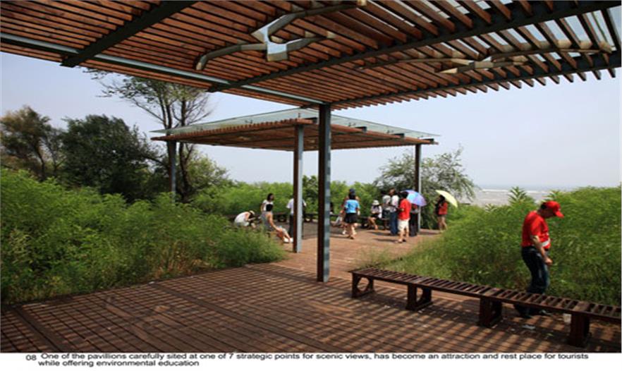 木棧道位于多風的海岸,綿延5km長,分布有沙丘以及各種適應(yīng)多樣場地環(huán)境的植物群落:它們包括濕地的香蒲(Typha angustifolia) 群落,沙丘草本群落,以及紫穗槐灌木叢(Amorpha fruiticosa),檉柳林(Tamarix chinensis),刺槐林(Robinia pseudoacacia)和旱柳(Salix matsudana)。長期以來,海岸線被廢棄,侵蝕和荒蕪,讓游客和居民難以靠近。設(shè)計方案巧妙地設(shè)計了一條隨海岸線蜿蜒的木棧道,將不同的植物群落連接在一起。木棧道不僅讓游客在途中體驗不同的植物群落,也作為了一種土壤保護設(shè)施,能夠保護海岸線免受海風、海浪的侵蝕。因為采用了生態(tài)友好的玻璃纖維基礎(chǔ),木棧道能“漂浮”在沙丘和濕地之上。玻璃纖維基礎(chǔ)是特別預制的容器,根據(jù)土壤狀況可以事先填滿沙子,也可以中空。這種創(chuàng)新的專利技術(shù)(本設(shè)計師發(fā)明并擁有專利)不僅比傳統(tǒng)建筑方法在自然環(huán)境中安裝木棧道更加簡易同時也把對環(huán)境的影響降到了最低。休息亭、遮蔭棚和環(huán)境解說系統(tǒng)沿著木棧道設(shè)置,全都根據(jù)周圍景色謹慎選址,使其能夠?qū)龅氐纳鷳B(tài)意義視覺化并突出了海岸的美麗景色。亭子變成了景點,吸引了成群的游客和當?shù)鼐用?/span>來欣賞美景和休息游玩。