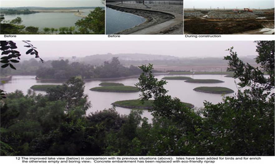 此區(qū)在項目的最東邊,之前是一個由水泥堤防構(gòu)成的公園,水泥堤主要是為了保護海岸線免受侵蝕,并用圍截漲潮海水的方法來造湖。顯然這個公園既不生態(tài)也不美觀,水泥堤壩單調(diào)乏味,湖也被僵硬的水泥岸線所環(huán)繞,空曠而乏味。再生設(shè)計策略包括拆掉水泥堤岸,用環(huán)境友好的碎石取而代之;同時修建一條木棧道取代硬質(zhì)鋪裝,使用當?shù)氐牡乇恢参飦砭G化木棧道沿線的地面。另外,湖心建了9個綠島以豐富單調(diào)的水面,并為鳥類休憩和筑巢提供場地。