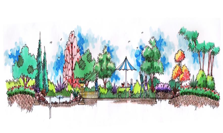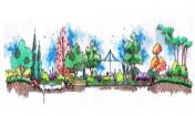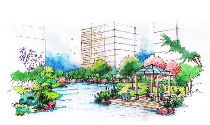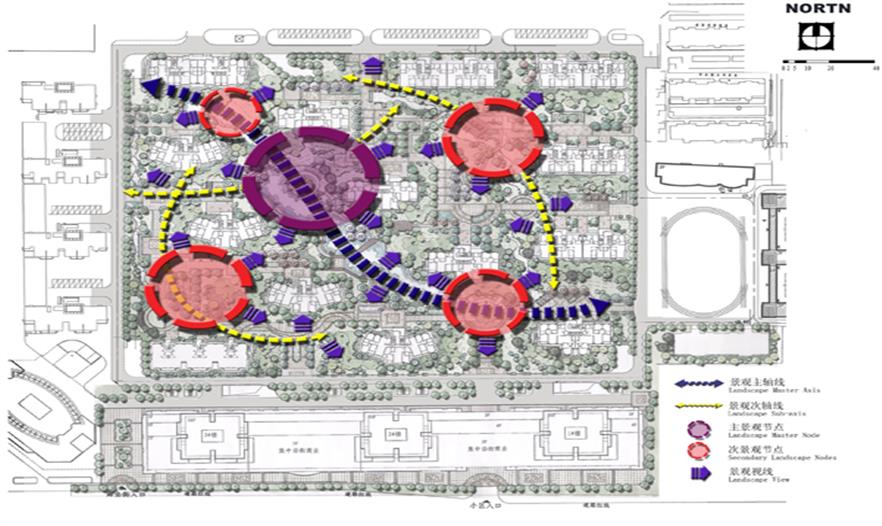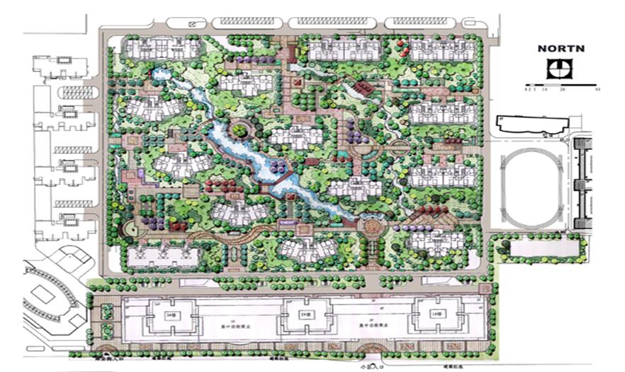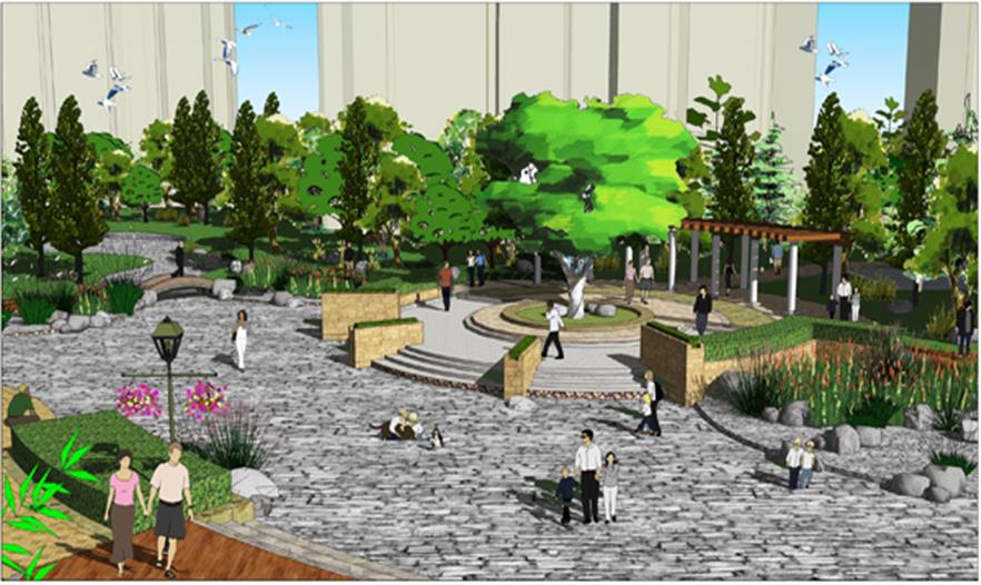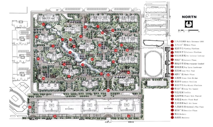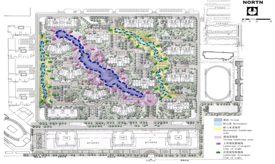 以現(xiàn)代大都市為背景,北方山水園林景觀為依托,以水景為主軸,枯山水、點(diǎn)式水景、親水平臺、廣場、植物造景為景觀節(jié)點(diǎn),以豎向變化豐富的自由起伏、下沉式水體為骨架(因北方特殊的氣候條件)冬季在枯水季節(jié),主水景可形成下沉廣場,變成人們休憩、娛樂、晨練等綠色健康生活的活動空間,通過生態(tài)環(huán)保材料的使用與中水的利用,一年四季豐富的植物材料搭配使用,構(gòu)成一幅和諧、自然、健康的綠色生態(tài)社會。