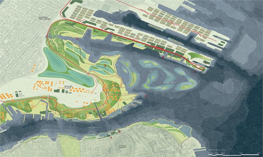 紐約海岸線海平面上升的前景令人擔(dān)憂。讓我們看一下預(yù)期的洪泛區(qū),例如,科學(xué)家預(yù)計(jì)該區(qū)中每50年中就會有一年可能將有85%的區(qū)域淹沒在水下。面對這樣嚴(yán)峻的現(xiàn)實(shí),我們積極應(yīng)對即將到來的水面上升,重新改建海岸,以制造出一個可持續(xù)的充滿活力的未來。