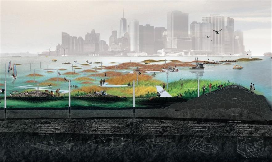 有生命的礁石建于由毛茸繩和木樁構成的柔軟基質(zhì)上。次潮間帶和潮間帶削減了風暴中波浪的能量,同時在沉淀物堆積層之上生長著可過濾水的軟體動物。在高水位線之上的群島不僅能夠使水平緩,同時也能形成生態(tài)庇護和休閑空間相結合的復雜網(wǎng)絡。