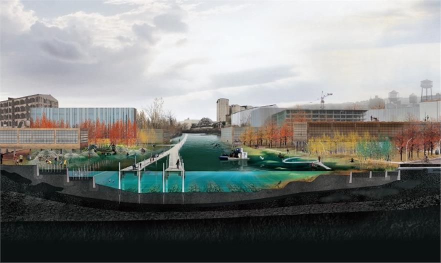 我們回顧這一地區(qū)的歷史以探求這一地區(qū)未來發(fā)展的預景?,F(xiàn)在的紅鉤/高斯瓦納地區(qū)之前曾是由各個小島組成的群島,淺的潮灘和蜿蜒的水道聯(lián)系,其中長滿了牡蠣和其他水生生物。暗礁和淺灘保護著周邊的內(nèi)陸地區(qū),同時也是周邊經(jīng)濟繁榮的一部分。牡蠣是一種令人驚嘆的動物。它通過生物過程清潔水體,并聚集在礁石結構周邊,以減緩水流。我們對未來治理的預景是通過牡蠣的生物力量來產(chǎn)生變化。將牡蠣沿高斯瓦納的海岸養(yǎng)殖,并播灑在柵欄狀的礁石上,以在運河和海灣之間的地區(qū)創(chuàng)造出一種互利共生的關系,既保護和清潔了水域,同時也創(chuàng)造出了公共空間的新形式。清潔和干凈的水體意味著我們可以重新設想與水的互動關系,將紐約的重心重新放到港口上,同時冠以紐約“世界牡蠣之都”的美名。