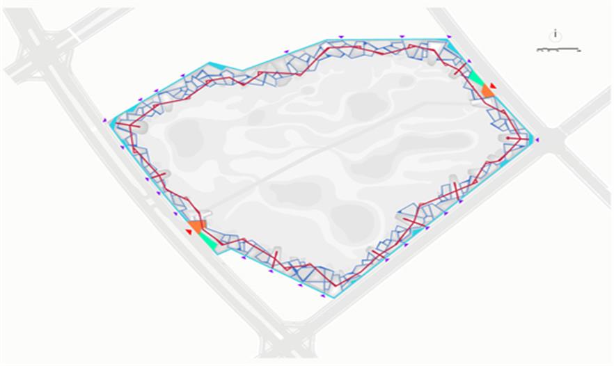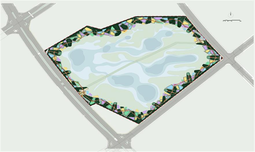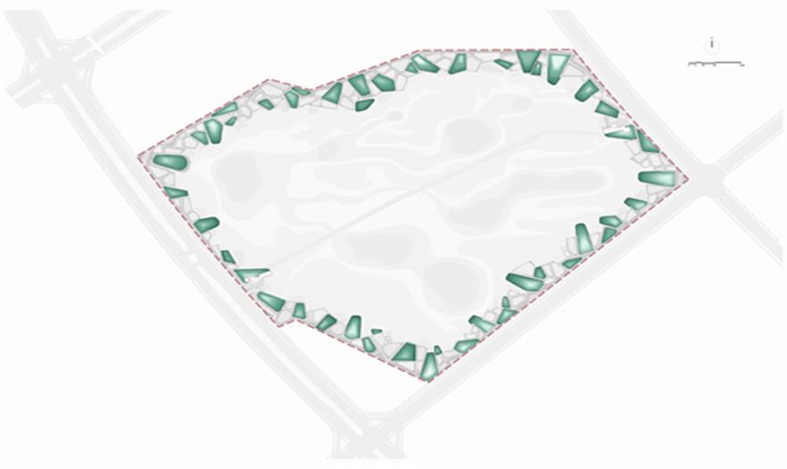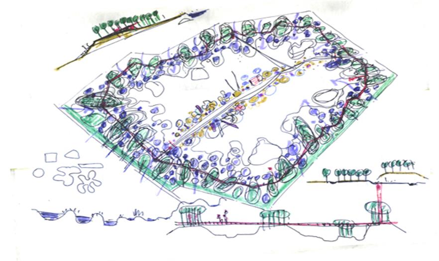 設(shè)計策略是:保留場地中部的大部分區(qū)域作為自然演替區(qū),沿四周通過挖填方的平衡技術(shù),創(chuàng)造出一系列深淺不一的水坑和高地不一的土丘,成為一條藍(lán)-綠項鏈,形成自然與城市之間的一層過濾膜和體驗界面。沿四周布置雨水進(jìn)水管,收集城市雨水,使其經(jīng)過水泡系統(tǒng)經(jīng)沉淀和過濾后進(jìn)入核心區(qū)的自然濕地山丘上密植白樺林,水泡中為鄉(xiāng)土水生和濕生植物群落。高架棧橋連接山丘,布道網(wǎng)絡(luò)穿越于丘林。水泡中設(shè)臨水平臺,丘林上有光觀亭塔之類。創(chuàng)造豐富多樣的體驗空間。