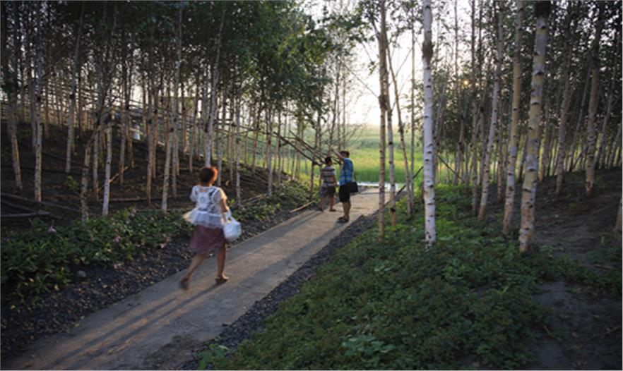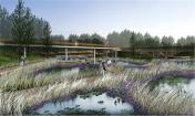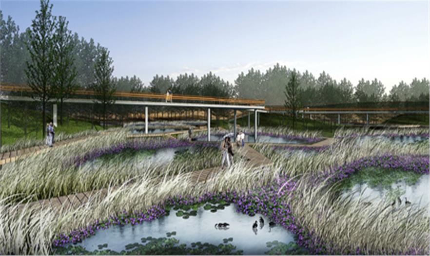 2009年中,受當(dāng)?shù)卣?,北京土人景觀與建筑規(guī)劃設(shè)計研究院承擔(dān)群力新區(qū)的一個主要公園設(shè)計,占地34公頃,為城市的一個綠心。場地原為濕地,但由于周邊的道路建設(shè)和高密度城市的發(fā)展,導(dǎo)致該濕地面臨水源枯竭,濕地退化,并將消失的危險。土人的策略是將該面臨消失的濕地轉(zhuǎn)化為雨洪公園,一方面解決新區(qū)雨洪的排放和滯留,使城市免受澇災(zāi)威脅,同時,利用城市雨洪,恢復(fù)濕地系統(tǒng),營造出具有多種生態(tài)服務(wù)的城市生態(tài)基礎(chǔ)設(shè)施。實踐證明,設(shè)計獲得了巨大成功,實現(xiàn)了設(shè)計的意圖。