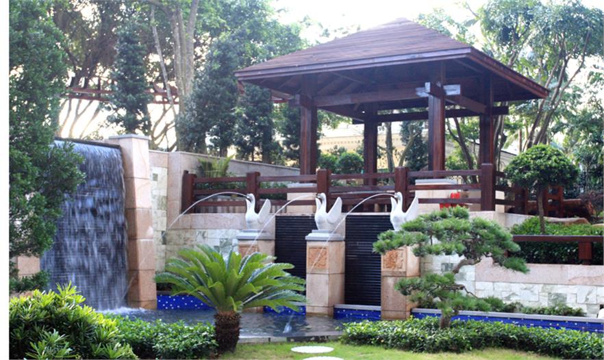 根據(jù)地貌地形,在典雅古樸的庭院下,設(shè)計(jì)的跌水景墻,展翅的白鵝噴泉雕塑,一池清水邊上點(diǎn)綴清秀雅致的五針?biāo)?,將中?guó)傳統(tǒng)的文化氣息融入其中。