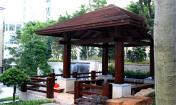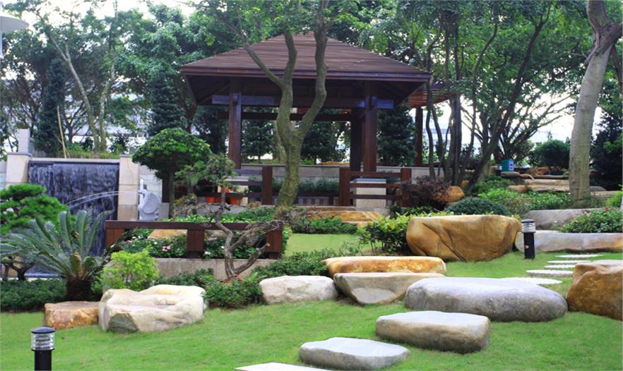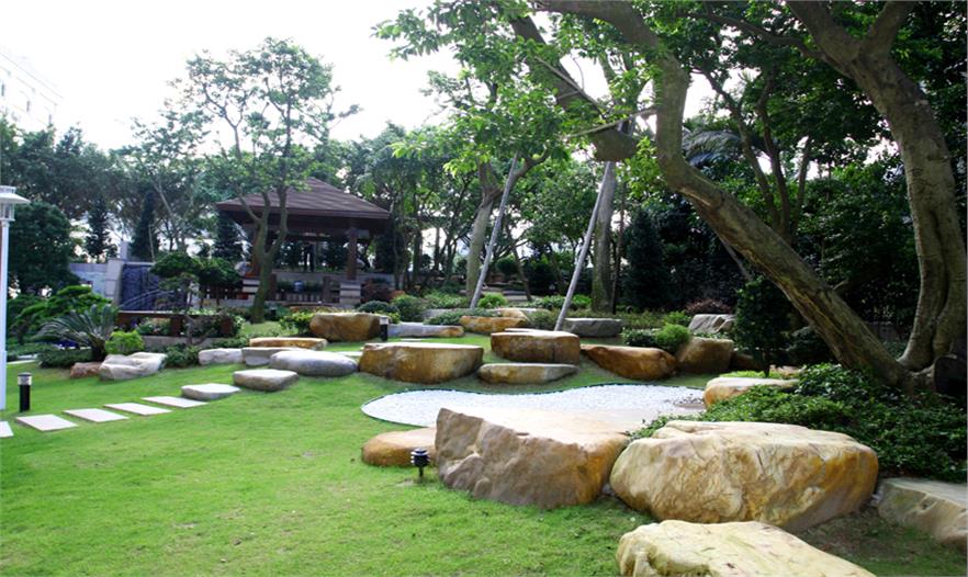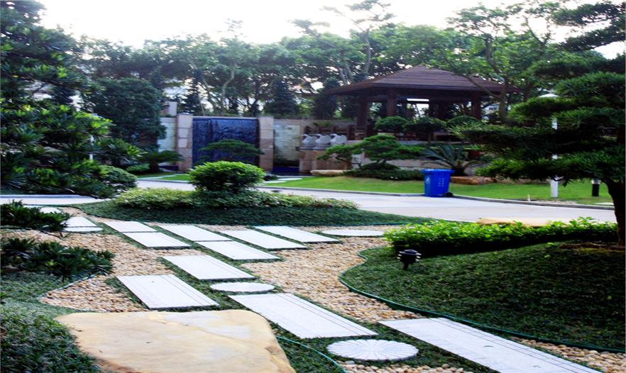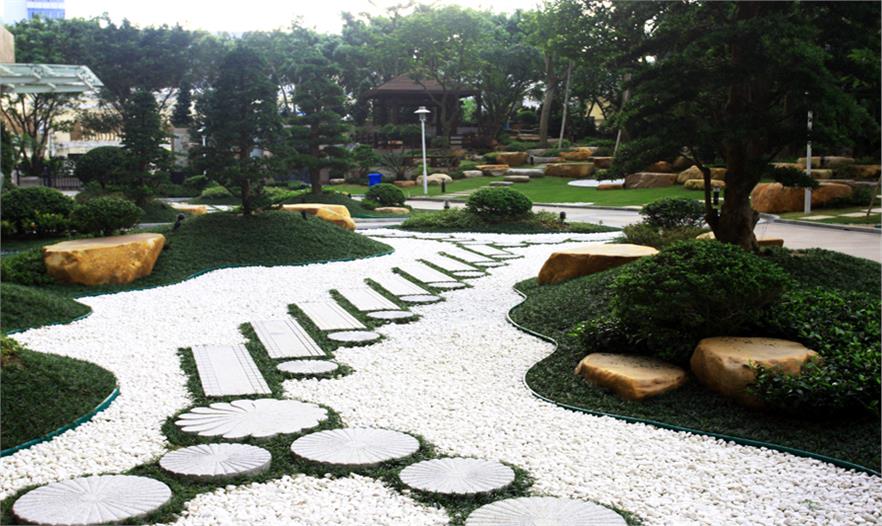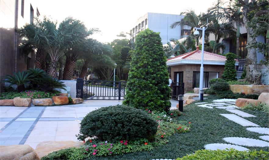 白色碎石、卵石隨著園路的延伸鋪設(shè)的園地,將造型精致的汀步完美呈現(xiàn),入口處叢植的蜜棗下配置較耐蔭的蘇鐵,時(shí)花為地被,進(jìn)行陪襯,形狀不一的黃蠟石圍成花臺(tái),新穎別致。