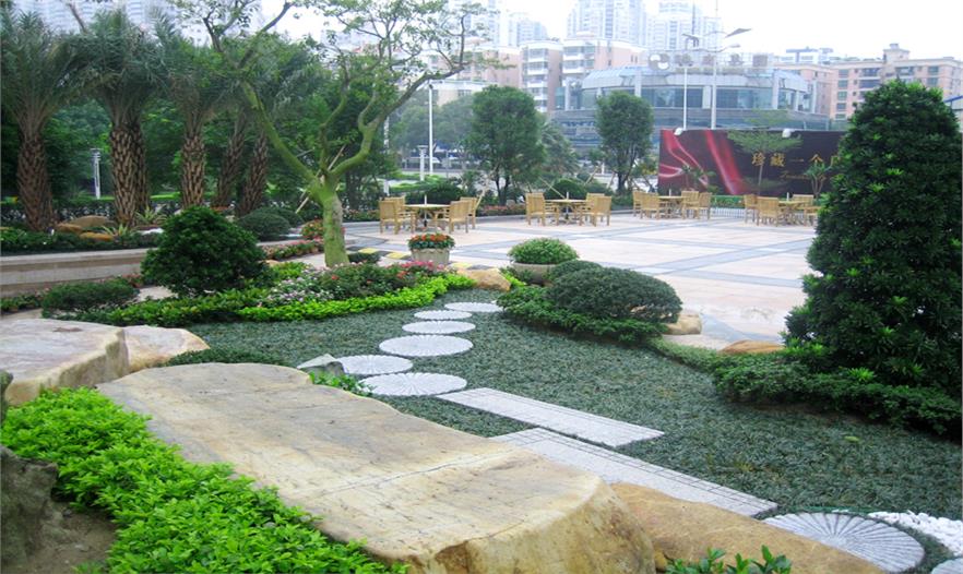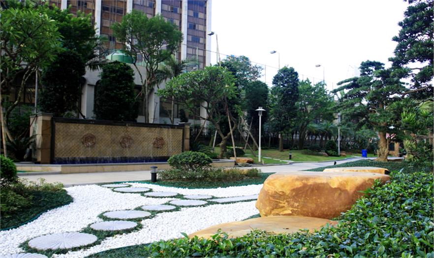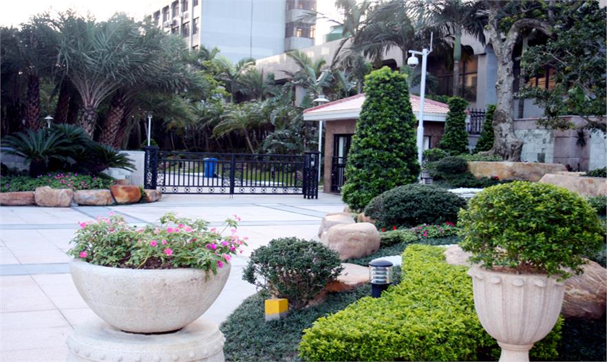 塔形羅漢松與石頭景觀的搭配,與圓球形的米蘭、黃金榕相對(duì)比,以及花缽的設(shè)置等別出心裁的設(shè)計(jì),巧妙的渲染了整個(gè)環(huán)境。