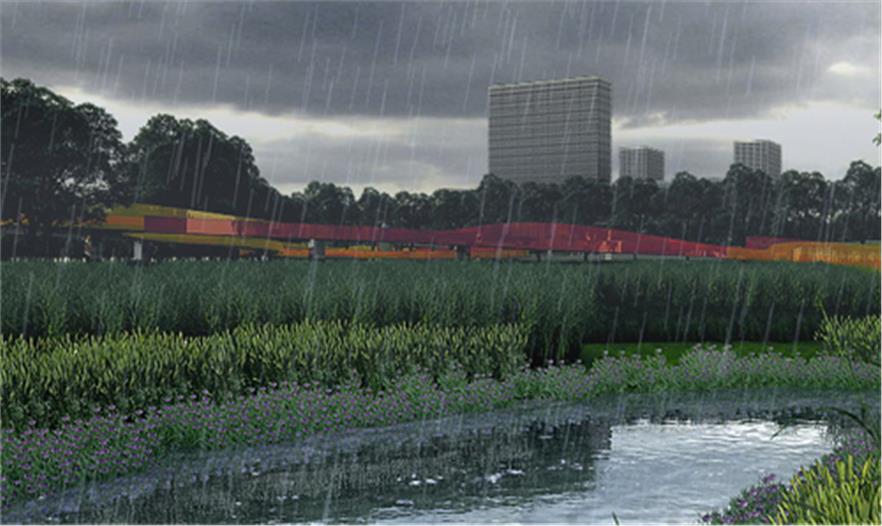 從周?chē)值郎鲜占某鞘杏晁?,通過(guò)貫穿芝加哥藝術(shù)之田的渠道系統(tǒng)被導(dǎo)入9個(gè)濕地池塘,這些池塘被策略性地排布為一個(gè)自然過(guò)濾系統(tǒng),并在南端與水渠和瀑布相連。公園中的水管理可以作為一個(gè)教與區(qū),鼓勵(lì)社區(qū)、區(qū)域,甚至更大范圍內(nèi)的可持續(xù)水管理;人們?cè)谙矈蕵?lè)的同時(shí)可以認(rèn)識(shí)到水是生命的重要組成部分,這樣就促成了實(shí)際的日常互動(dòng),進(jìn)而自然地將這種認(rèn)識(shí)推廣到社會(huì)。