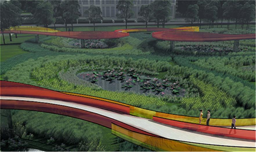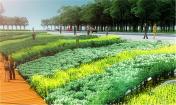 ?。?)芝加哥濕地:癌癥幸存者花園之東為低洼區(qū),現(xiàn)為花生公園,是理想的雨水匯集區(qū),可以設(shè)計(jì)濕地,成為北格蘭特公園與繁忙的濱湖道之間的緩沖帶。另外,該區(qū)的東部邊界將會(huì)設(shè)計(jì)一個(gè)觀景平臺(tái),從那里往東可以看到低洼處的濕地植物。濕地中的“野韭”是印第安人給芝加哥取的名字,在這里,真實(shí)的“芝加哥”的以重現(xiàn)。