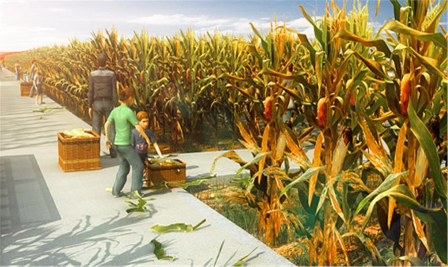 幾何格局允許靈活地使用簡(jiǎn)單的長(zhǎng)方形肌理。玉米作物作為由幾何道路劃分出區(qū)塊的主要元素,其高度隨生長(zhǎng)的周期性而變幻。這樣除了播種和收獲田里的谷物與果園的水果之外,還可以給其他各種各樣的活動(dòng)提供開(kāi)放空間。通過(guò)增加其他永久開(kāi)放空間的設(shè)計(jì)來(lái)滿足各種活動(dòng)的空間需要,例如:坐落在北端的兒童游樂(lè)場(chǎng)就是公園中一個(gè)重要的部分,將直接與兒童博物館相連;廣場(chǎng)將通過(guò)狹窄的甬道進(jìn)入開(kāi)放的廣場(chǎng),創(chuàng)造出不同的氛圍,設(shè)置包括多媒體藝術(shù)展示和藝術(shù)平臺(tái)的參觀空間。在南端,蔬菜園將起到休憩空間的作用,并最終成為一個(gè)就餐空間,與紀(jì)念品商店和餐廳整合為一體。