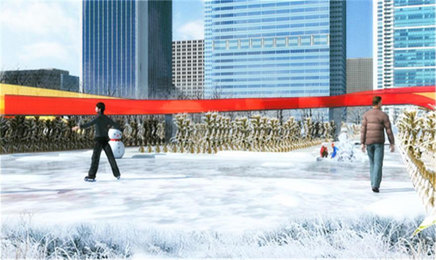 將水作為另一個(gè)過(guò)程引入景觀,而此過(guò)程就是生命本身。水可以再生且?guī)?lái)勃勃生機(jī),將用于場(chǎng)地的主要活動(dòng)路徑上,可以給穿越場(chǎng)地的游人提供一個(gè)清凈互動(dòng)的場(chǎng)所。從圖中可以看出水系的4個(gè)主要組成部分:中心水渠、瀑布、濕地池塘和凈化溪流系統(tǒng)。水渠中的水既能用來(lái)灌溉,又最終成為涉水小徑,可供游憩。在規(guī)劃圖上這些水區(qū)被集中起來(lái),在最北和最南端形成用于聚會(huì)和休閑溜冰或者戲水的較大場(chǎng)所。在冬天,這些小徑結(jié)凍變成了線性的溜冰道,人們可以在上面自由地滑冰,可獲得獨(dú)特的體驗(yàn)。