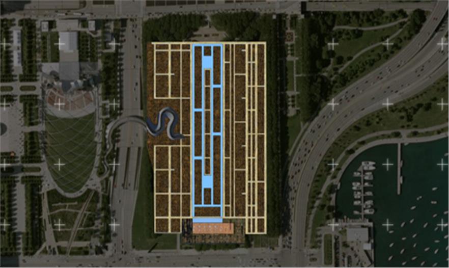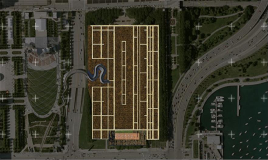 玉米地以高效低耗的方式為場(chǎng)地植入一個(gè)文化圖騰,使項(xiàng)目具備:空間使用上的靈活性、可最終更換作物的靈活性和低廉的維護(hù)。還強(qiáng)調(diào)生命的自然周期,重新建立城市與土地的聯(lián)系,同時(shí)擁有高潛力適應(yīng)性景觀,這將永久地吸引芝加哥市民的注意力。選擇種植玉米是出于淺層土壤的考慮;玉米地啟發(fā)了一個(gè)與城市與區(qū)域的文化和農(nóng)業(yè)遺產(chǎn)相關(guān)的生產(chǎn)性景觀解決方案,同時(shí)保持了對(duì)地下停車(chē)庫(kù)結(jié)構(gòu)的較低負(fù)荷。