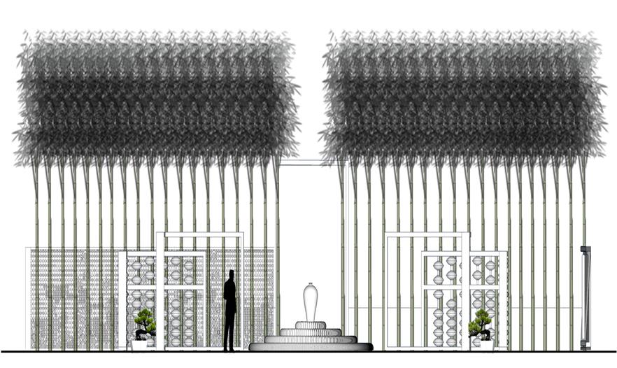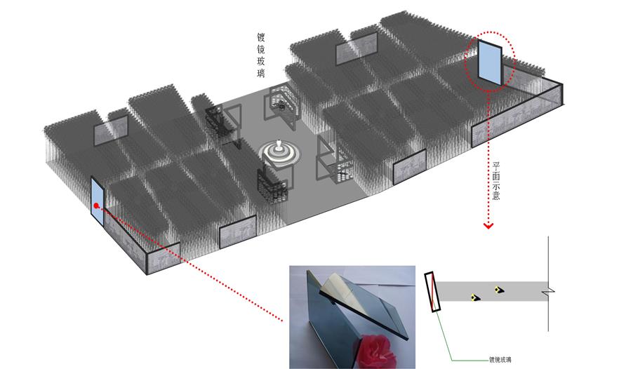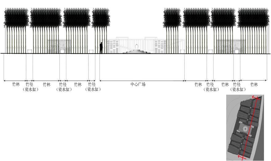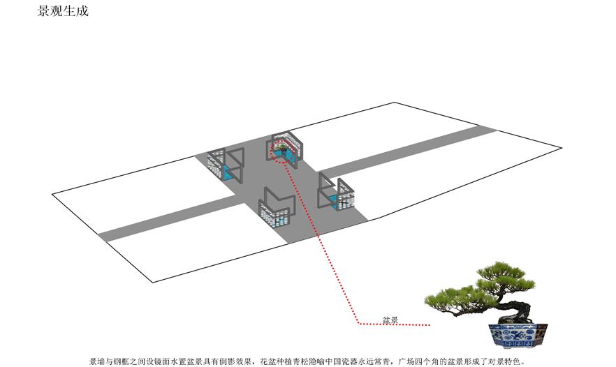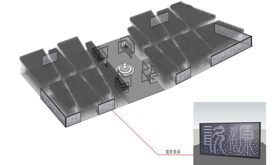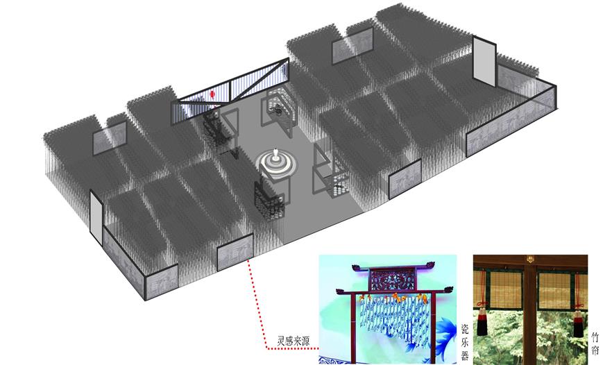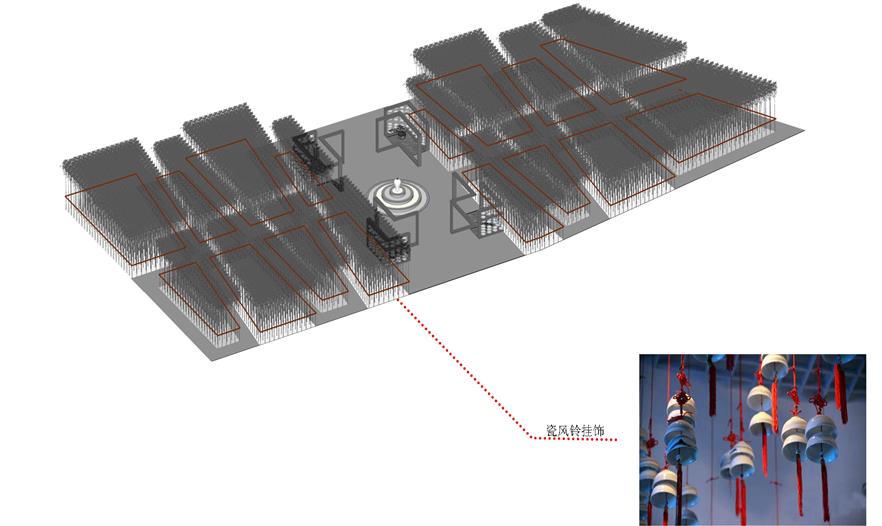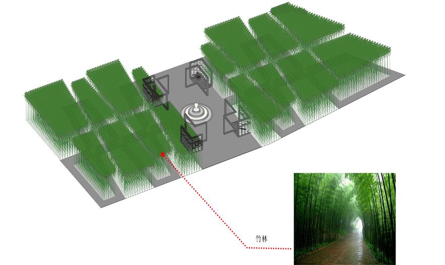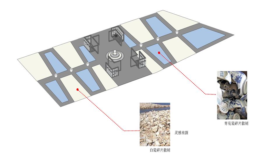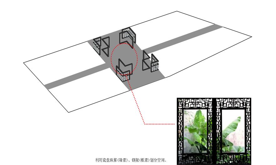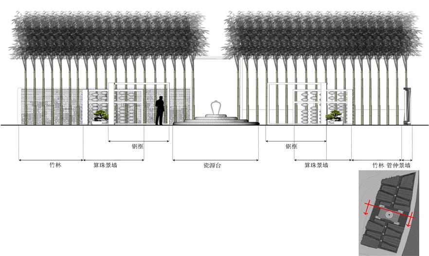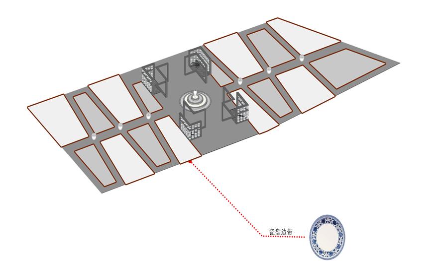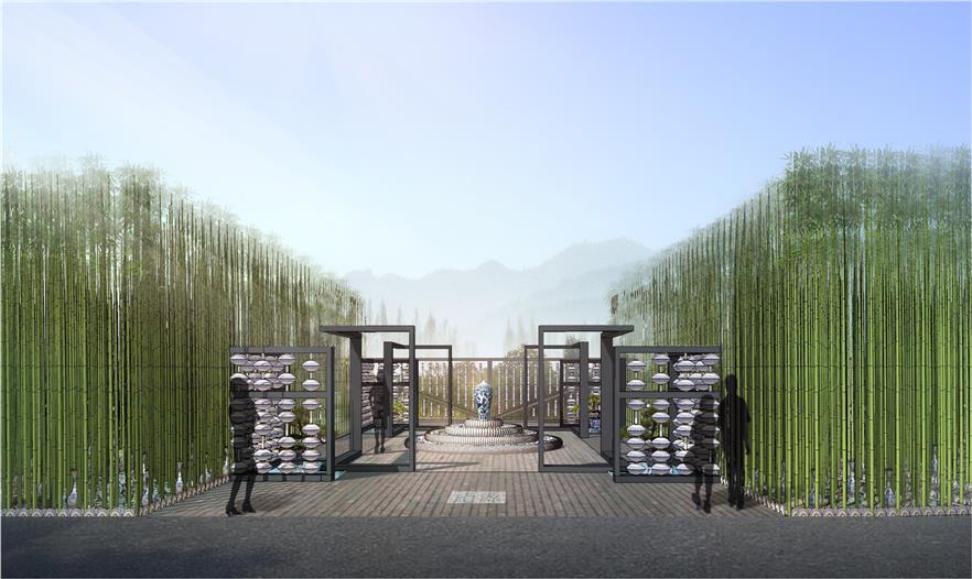 空間利用瓷筆筒、瓷盤(pán)、瓷碗、瓷缸、瓷管仲、瓷瓶、瓷盆、瓷枕、瓷片和竹子等要素有機(jī)結(jié)合與重構(gòu),通過(guò)借景、對(duì)景、框景、障景、點(diǎn)景等傳統(tǒng)造園手法結(jié)合現(xiàn)代的空間造型藝術(shù)、構(gòu)圖方式、行為習(xí)慣等為游人提供一個(gè)具有回憶話題的交流空間,在統(tǒng)一的基礎(chǔ)上求變化,在變化中求統(tǒng)一,形成起結(jié)開(kāi)合的動(dòng)態(tài)序列空間。