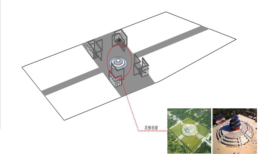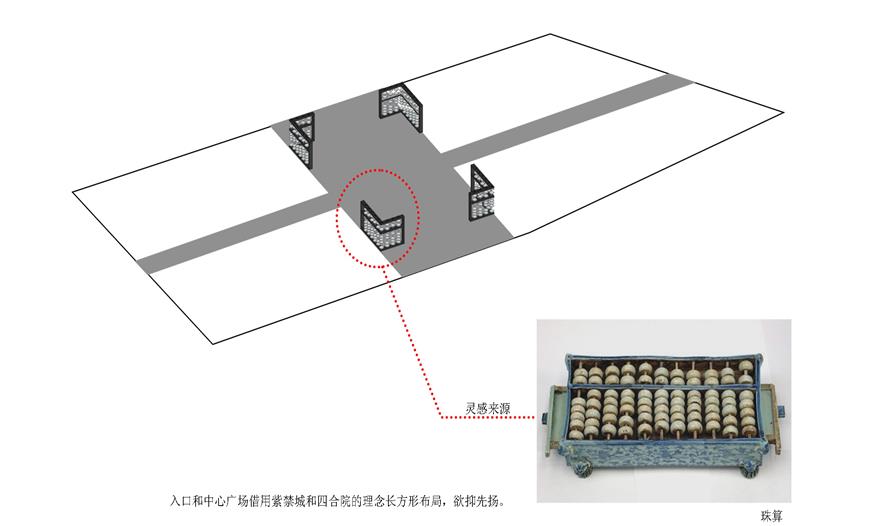 在北京就應(yīng)該與當(dāng)?shù)氐娜宋奶卣飨嗦?lián)系,這既是對(duì)城市文脈在時(shí)光中的延續(xù),也是體現(xiàn)北京城市內(nèi)涵的理想方式。瓷源總體布置現(xiàn)代簡(jiǎn)約,在平面上更多的從當(dāng)?shù)氐奶攸c(diǎn)入手,以城市的代表紫禁城和四合院以及中軸為機(jī)理;天壇為核;胡同為脈;瓷為魂;竹為骨架的構(gòu)圖方式,形成一心兩軸兩翼的對(duì)稱(chēng)式布局,在兩翼中穿插斜線組織游賞路線,追求整體均衡但又富有變化。