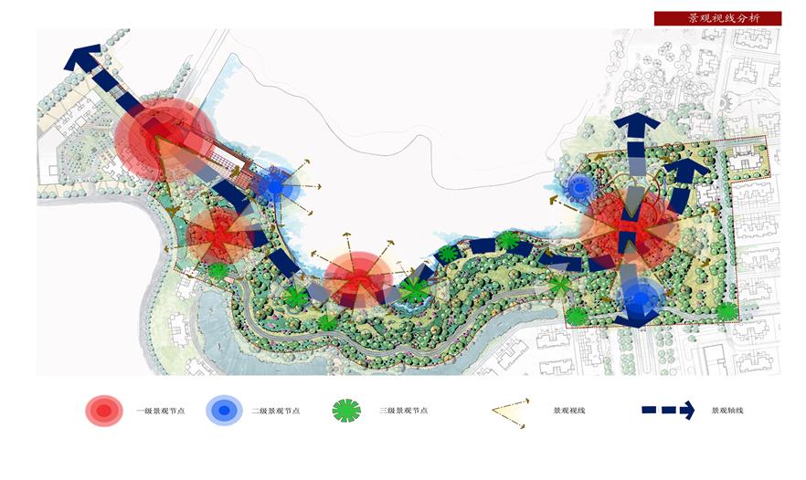 內(nèi)部視覺體驗(yàn)的多樣性,空間的閉合與開放,場景的不同,動(dòng)靜的不同等都給人以豐富的視覺享受。通過對(duì)地勢的改造處理,提高或降低視點(diǎn)來變化京觀點(diǎn)。