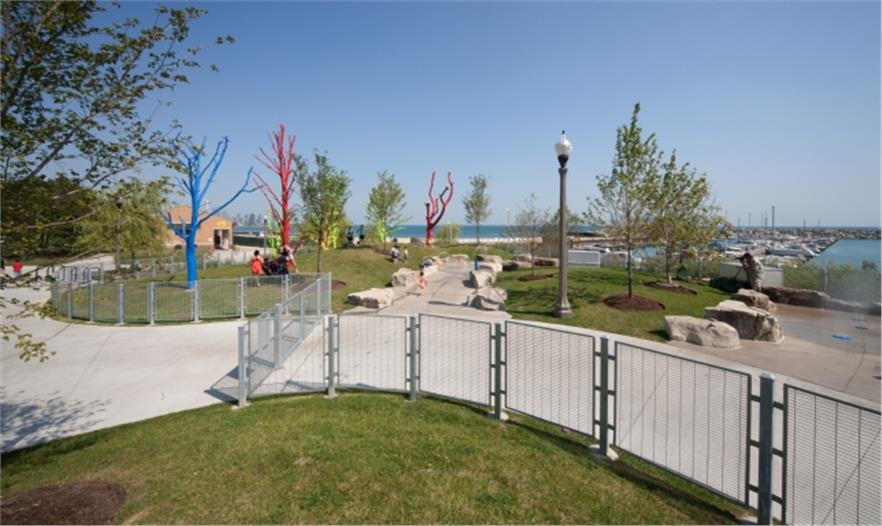 第31街港口是在過去50年中芝加哥最大的港口之一,由密歇根湖濱未被充分利用的區(qū)域改建而成。不同于傳統(tǒng)港口,這里還有1000個船塢和一個公園,將高端工程技術(shù)與舒適的空間布局相結(jié)合。港口設(shè)計概念源于當(dāng)?shù)氐臍v史、文化和環(huán)境條件,成型過程中設(shè)計師還考慮了當(dāng)?shù)仫L(fēng)向、漂流物、沙丘、沉積物等多種因素的情況。港口的一部分還是綠色屋頂?shù)臉幼?,供游人欣賞周邊美景,沿岸種植著低矮的植被,還有海濱散步道等等。新建的廣場也為當(dāng)?shù)厥忻裉峁┝撕线m的休閑區(qū)域。