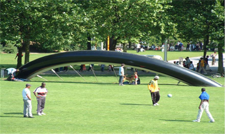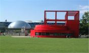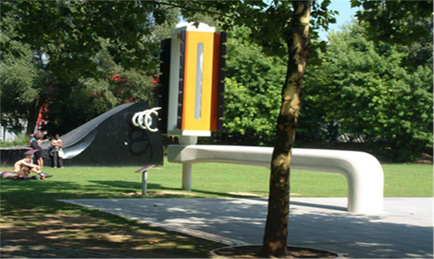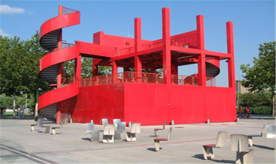 維萊特公園是西方后現(xiàn)代最具典范的景觀,它既不是傳統(tǒng)的法國(guó)景觀,更不是自然造化的英國(guó)景觀。既不是古典的,也不是現(xiàn)代的。而是一座后現(xiàn)代的(或極現(xiàn)代的),有人說它是二十一世紀(jì)的景觀。它在卓越完美的未來主義形式里,既沒甚么花草植物,更沒有蔥蘢茂密的林木,但擁有一大片開放式的翠綠空間,這正是后現(xiàn)代景觀最大的特色之一,形成都會(huì)里的多元功能的遣興空間(例如戶外音樂會(huì)、電影、馬戲團(tuán)、運(yùn)動(dòng)、散步遣興與各式各樣的展覽等等)。整座公園在完美幾何流線建筑形式里,展現(xiàn)出很具體的觀念、很抽象、但又很具體的點(diǎn)、線及面之結(jié)構(gòu)。就像前衛(wèi)造型藝術(shù)般,充滿想象的形式與實(shí)質(zhì)的空間,賞心悅目,成為巴黎人逍遙遣興的杰佳地點(diǎn)。