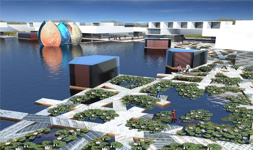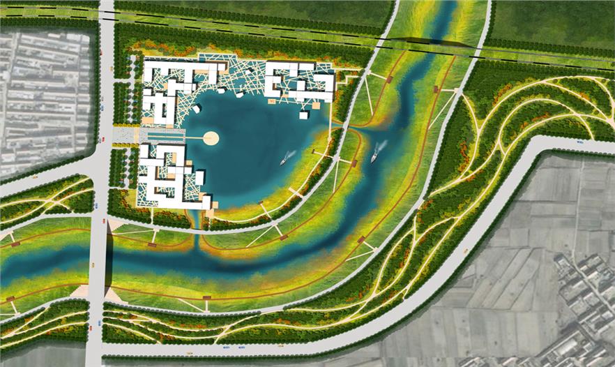 Project aims to discuss the relationship between the rain flood management and site to participate in landscape and architecture of fusion, skin texture and the use of material.In history,project site wasmarshy, there were large wetlands and lotus pond. It was floodway when flood detention area.The plan aims to make the lotus pond,It is a scenic zone, and also have the effect of regulating flood. Lotus pond park planning and design has a unique experience space, and make business combined with landscape. Lotus pond and architectural transition section is full of diagonal lines interweave in the road, forming a triangle or a rectangle in the lotus pond, plank road use of composite materials with water permeability, shale, bricks, gravel, people can close contact with lotus pond on the plank road feel unique experience.Most of the underlying buildings built on stilt, forreservingenough spaceto participatory lotus pond, and built roof space and far spacethrough the ramp link.