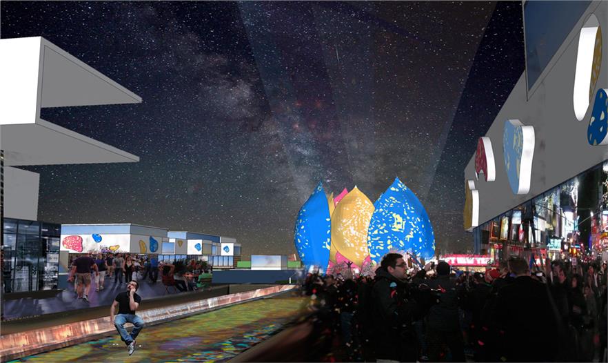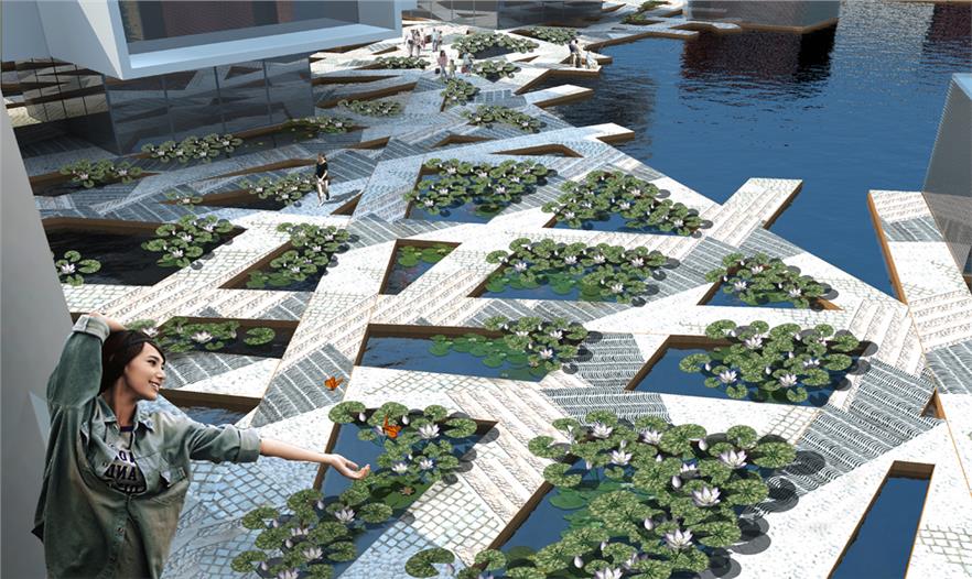 項目旨在探討雨洪管理與場地參與的關(guān)系,景觀與建筑的融合,場地肌理與材料的使用。在歷史上項目場地曾經(jīng)沼澤遍布,存在大片濕地與荷塘,為洪潮交匯時滯洪區(qū)域,規(guī)劃旨在使荷塘回歸,使其既是一道風(fēng)景,同時也起到調(diào)節(jié)洪水的作用。公園規(guī)劃設(shè)計具有獨特體驗的荷塘空間,并且使商業(yè)與景觀結(jié)合。荷塘與建筑交接的部分布滿斜線交織的棧道,形成三角形或者矩形的荷花池,棧道運用具有滲水性的綜合材料,頁巖、磚瓦、碎石,人們可以在棧道上與荷塘近距離接觸,感受到獨特的體驗,建筑底層大部分架空,給參與性荷塘留有足夠空間,并通過坡道聯(lián)系建筑屋頂空間與荷塘空間。
