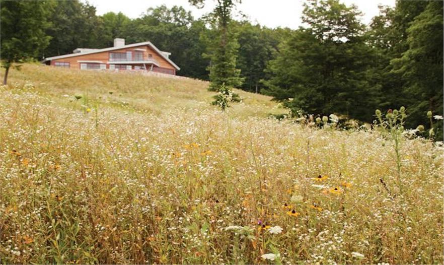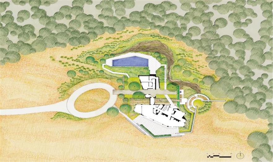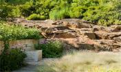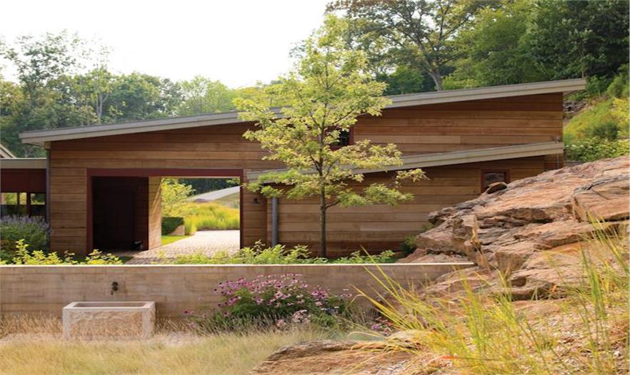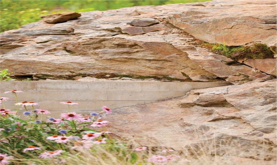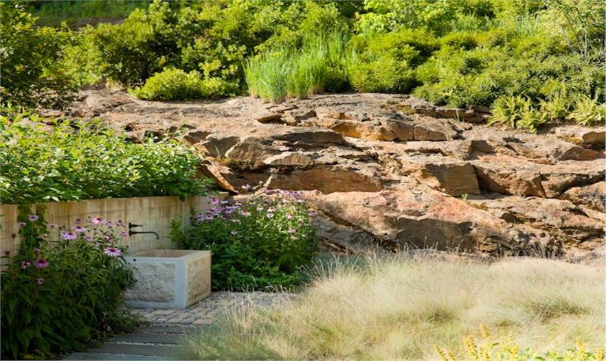 當(dāng)代建筑缺乏一種激動(dòng)人心的美感,在一些建筑博客和書(shū)籍中它們常常是華而不實(shí)的低等設(shè)施。但是極具藝術(shù)性的卻又不會(huì)為室外空間或花園預(yù)留過(guò)多空間。關(guān)于這個(gè)問(wèn)題,是否有一種折衷的解決辦法呢?近期,Nelson Byrd Woltz事務(wù)所的Thomas Woltz為我們展示了如何利用土生植物和一些大膽的結(jié)構(gòu)造景并創(chuàng)造一座與時(shí)俱進(jìn)的康乃迪克住宅,使其看起來(lái)就像是與周邊山地休戚與共、與生俱來(lái)的建筑。“甲方通常想要讓他們的地盤(pán)更富有自然氣息,”Woltz說(shuō),“他們會(huì)因?yàn)閾肀ё匀欢_(kāi)心,我們要做的就是將住宅融入更大范圍的當(dāng)?shù)鼐坝^(guān),最好是在林地與草地間進(jìn)行設(shè)計(jì)。”那么他又是如何具體實(shí)施的呢?裸露的花崗巖基座是非常搶眼的建筑元素。這個(gè)景觀(guān)項(xiàng)目表明這座住宅(平面圖中底部中間的白色區(qū)域)依偎在附近密集的塊狀巖石間。Nelson Byrd Woltz建造了一些水泥矮墻,感覺(jué)像是用手指觸摸周?chē)纳降?、林?chǎng)、坡地、花園和水池。堆積的紫松果菊和刺球花可以生長(zhǎng)在不那么完美的環(huán)境中。在高出住宅的山地上,遍布著唐松草,野胡蘿卜和金光菊。一切看起來(lái)都富有自然氣息。