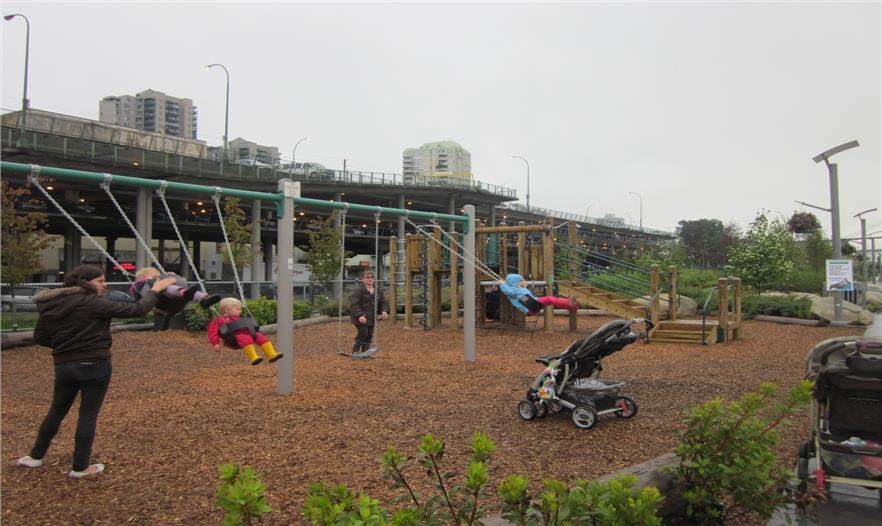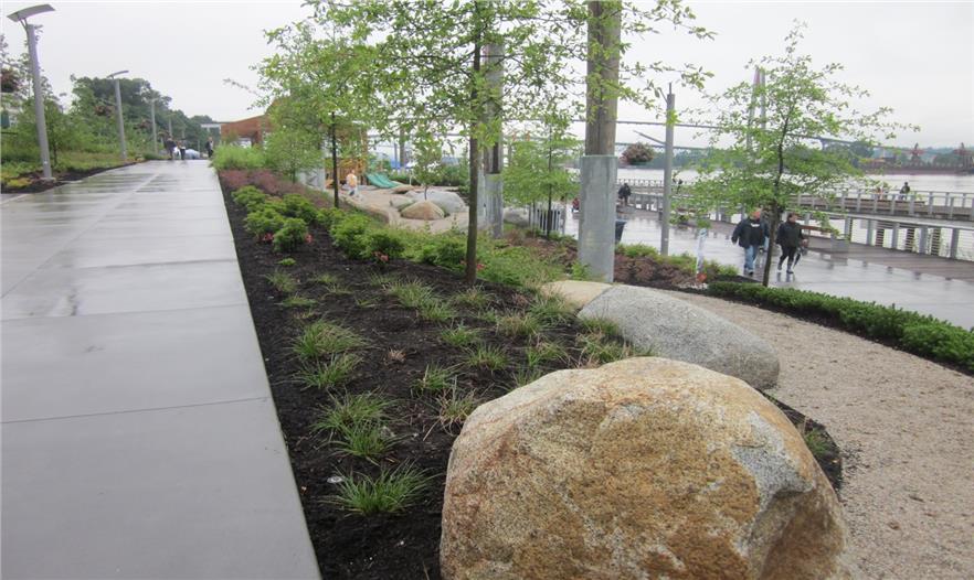 新威斯敏斯特市史無(wú)前例地在他們的河濱地區(qū)舉行慶?;顒?dòng),以紀(jì)念這座重工業(yè)城市開(kāi)辟的新公園。這座新公園與市中心只有咫尺之遙,它使城市核心和河濱地區(qū)重?zé)ㄉ鷻C(jī)。這座以“綠色”為主打理念的西敏碼頭公園已經(jīng)榮獲四項(xiàng)環(huán)境杰出貢獻(xiàn)獎(jiǎng),它占地38400平方米,位于菲沙河畔一座早已廢棄的工業(yè)棕地上,并且已于2012年6月向公眾開(kāi)放。這個(gè)項(xiàng)目移走了近3600噸被污染的土壤,并且用防洪堤來(lái)取代填湖措施,這些舉措有利于恢復(fù)當(dāng)?shù)匾驯黄茐牡纳鷳B(tài)環(huán)境。這座全新的居住環(huán)境為河畔淺灘創(chuàng)造了有利的生物多樣性環(huán)境,如今這里已有大量魚類和其它野生動(dòng)物的棲息所。這座城市公園生來(lái)健全,易于管理,無(wú)論是人造還是自然材料均可以在其75年設(shè)計(jì)壽命結(jié)束后被回收,對(duì)于新威斯敏斯特市來(lái)說(shuō),這也是至關(guān)重要的生態(tài)目標(biāo)。當(dāng)可持續(xù)性作為公園發(fā)展的一部分時(shí),這項(xiàng)設(shè)計(jì)不僅要對(duì)當(dāng)?shù)氐纳鷳B(tài)環(huán)境需求非常敏感,還應(yīng)該對(duì)未來(lái)的環(huán)境條件負(fù)責(zé)。