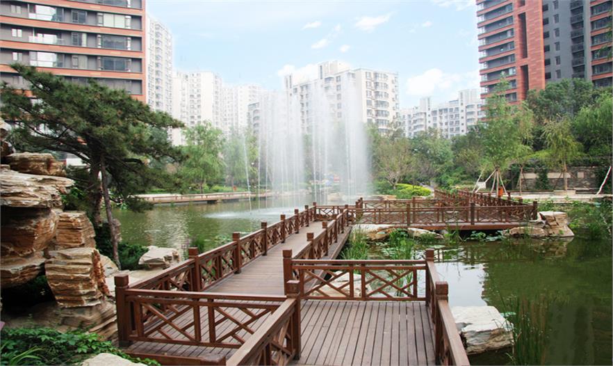 項目位于北京東四環(huán),四棟現(xiàn)代豪宅被窯洼湖公園、成樹密林公園、景觀綠帶公園、北京歡樂谷四大公園圍繞成一座幽雅靜謐的宅院,景觀設計運用“前案后山”的“山地+水景”規(guī)劃格局,成就了其作為城市豪宅更為生態(tài)、舒適的尊貴品質。