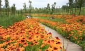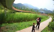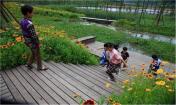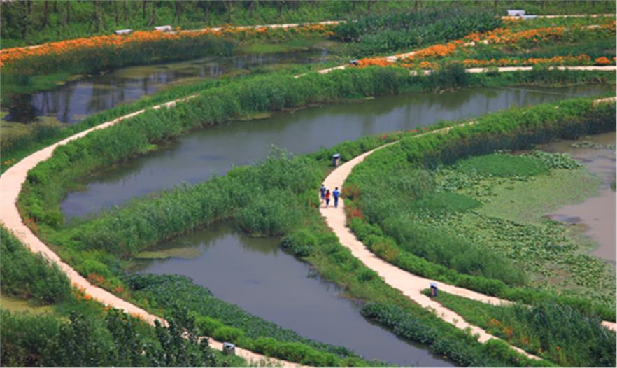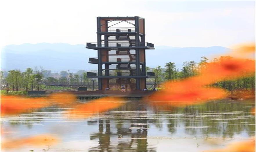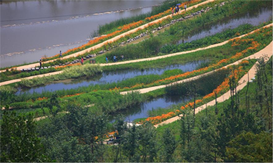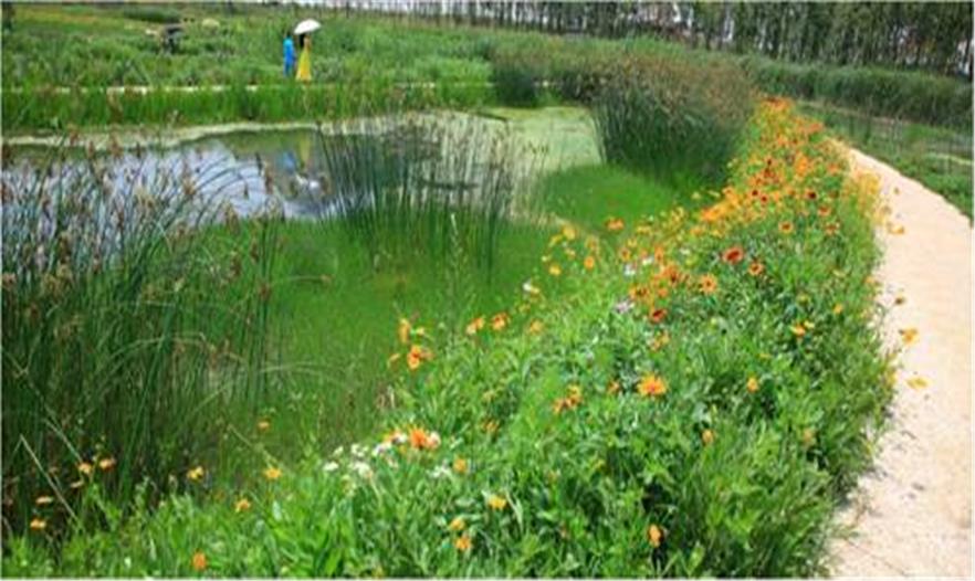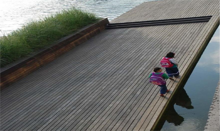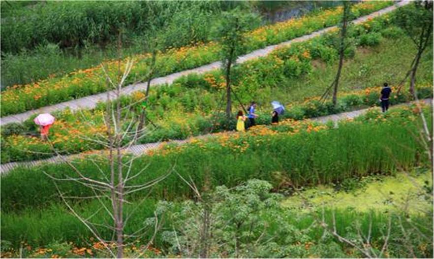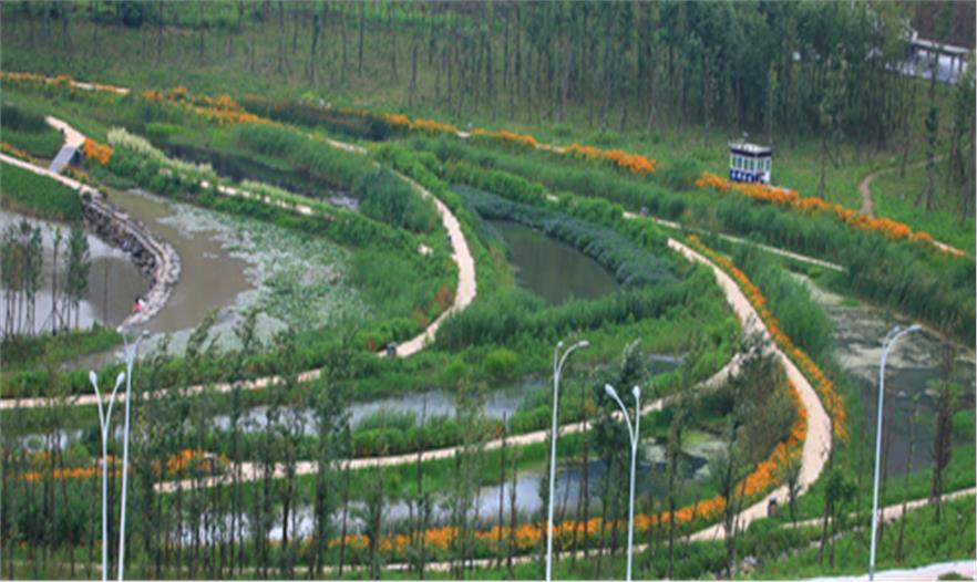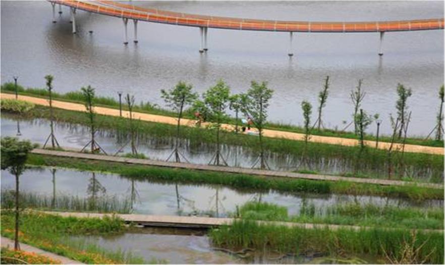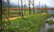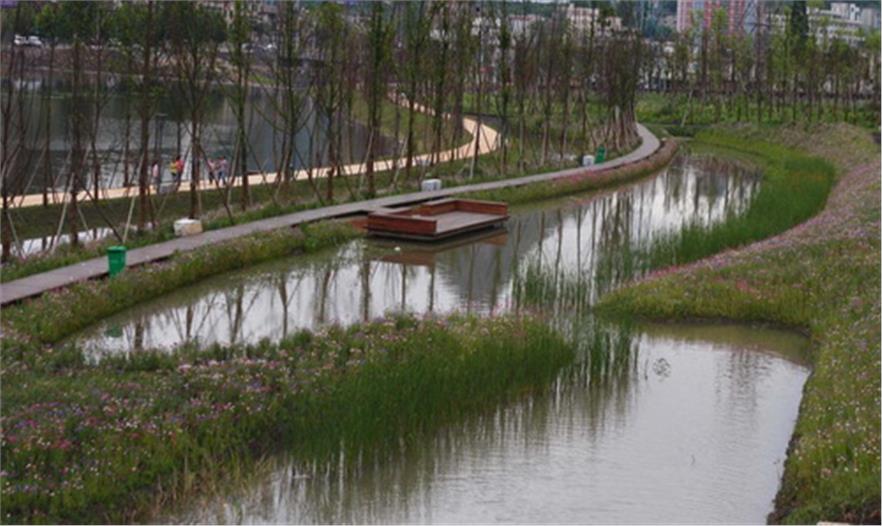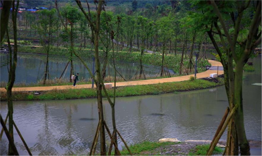 微觀上依據(jù)總體規(guī)劃的定位對具體河段進行設(shè)計。位于河道上游的一期工程由硬質(zhì)河道的生態(tài)改造與明湖濕地公園兩個部分組成,合計31.2公頃。河道充分利用濱河有限的15至20米綠帶空間及陡坎高差,建立濱河梯級景觀帶,實現(xiàn)河岸的生態(tài)化改造。濕地公園的設(shè)計中,結(jié)合場地高程及魚塘肌理,構(gòu)建梯級濕地系統(tǒng),調(diào)蓄與凈化山區(qū)流出的溪流。同時,為彰顯城市作為西南地區(qū)重要的煤炭鋼鐵工業(yè)基地的“鋼城”文化,建設(shè)了蜿蜒臥浮于濕地之上的“鋼化飛虹”步行景觀橋。此外,設(shè)計倡導(dǎo)野草之美與低碳景觀,大量應(yīng)用了低維護成本的鄉(xiāng)土植被,野花爛漫,水草繁茂,珠鏈碧河,漫步其間,人們仿若又回到了昔日蜿蜒流淌的母親河畔,它即將承載重建人與自然和諧相處的時代文明繼續(xù)前行。