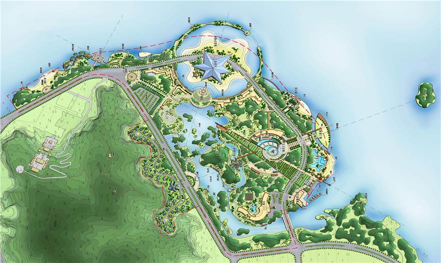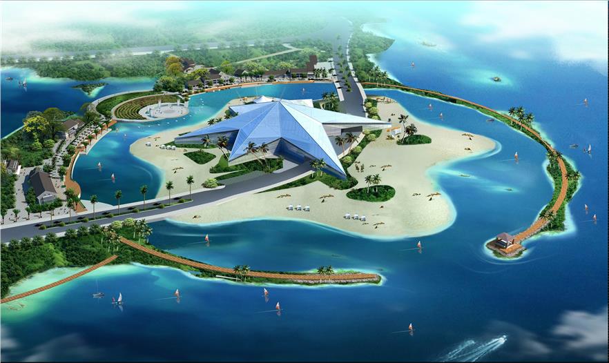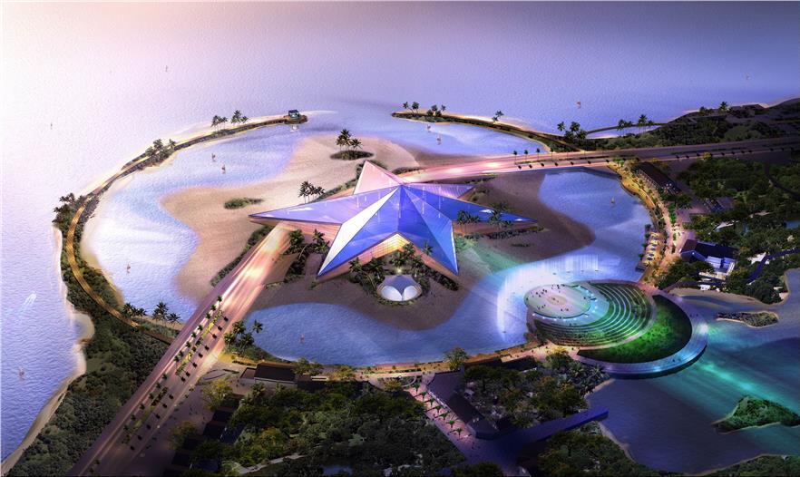 景區(qū)中央為一海星狀的水族館“海洋之星”,該水族館外型由海底動(dòng)物海星演變而來(lái),采用現(xiàn)代建筑材料,白天晶瑩剔透,夜晚熠熠生輝,形成整個(gè)公園的中心景觀建筑。