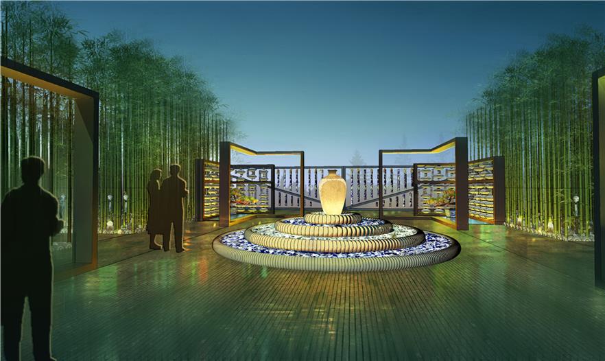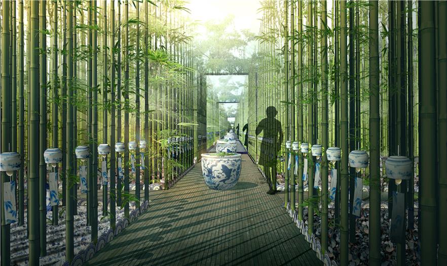 瓷器除了充滿藝術(shù)氣質(zhì)外,本身也是一種很理想的造園材料,它擁有非常堅硬的質(zhì)地,其精致光滑、潔凈剔透的表面非常符合表達造園的審美要求,而且運用成品材料還可以節(jié)省建造時間。以瓷器作為創(chuàng)作元素,將它貫穿到現(xiàn)代設(shè)計手法中進行重構(gòu),從而煥發(fā)新的生命。利用瓷所蘊涵的中國傳統(tǒng)園林的高貴、典雅的品質(zhì),通過符合現(xiàn)代人審美習(xí)慣的表現(xiàn)手法,將物質(zhì)與精神的感受統(tǒng)一表達,力圖創(chuàng)造一個具有歷史文化內(nèi)涵延續(xù)性和精神的感受統(tǒng)一表達,力圖創(chuàng)造一個具有歷史文化內(nèi)涵延續(xù)性和精神代表性的現(xiàn)代園林。這恰好是一種對中國悠久而具有精湛技藝的制瓷歷史的宣揚、傳承和創(chuàng)新。