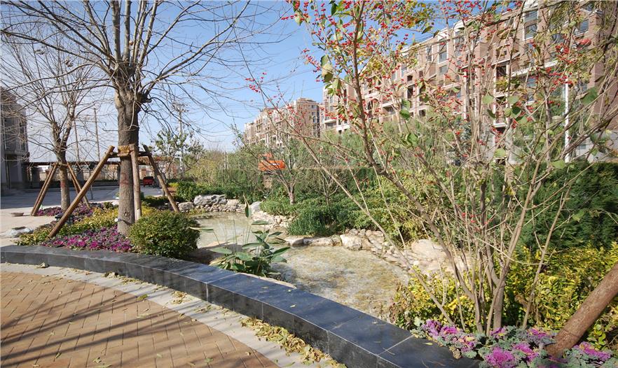 以色澤淡雅,枝形舒展的花卉、延展開闊的空間及整齊平靜的水體布局展現(xiàn)休閑、安靜的居住環(huán)境。