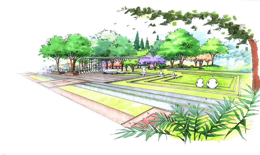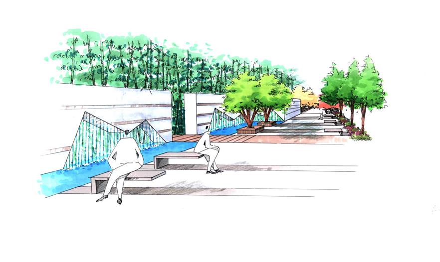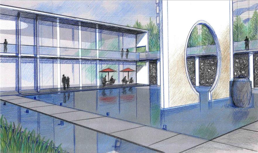 堂的設(shè)計(jì)中布局上體現(xiàn)傳統(tǒng)特色——簡約、大氣、開闊的氣勢。以水為主要構(gòu)成元素,池底鋪裝采用回紋圖案。