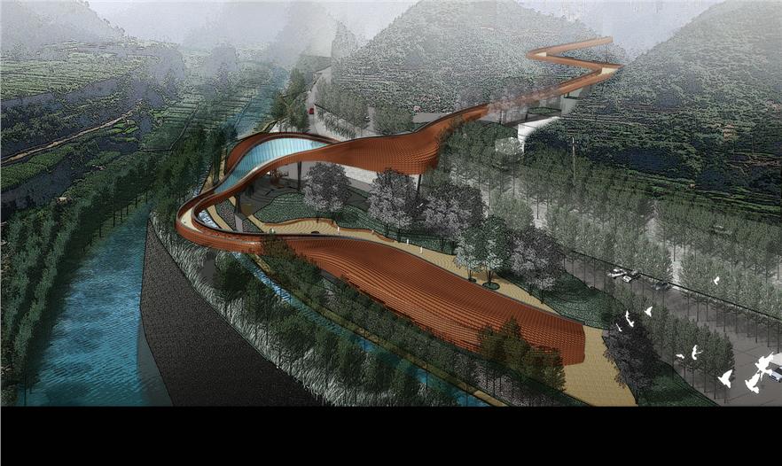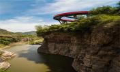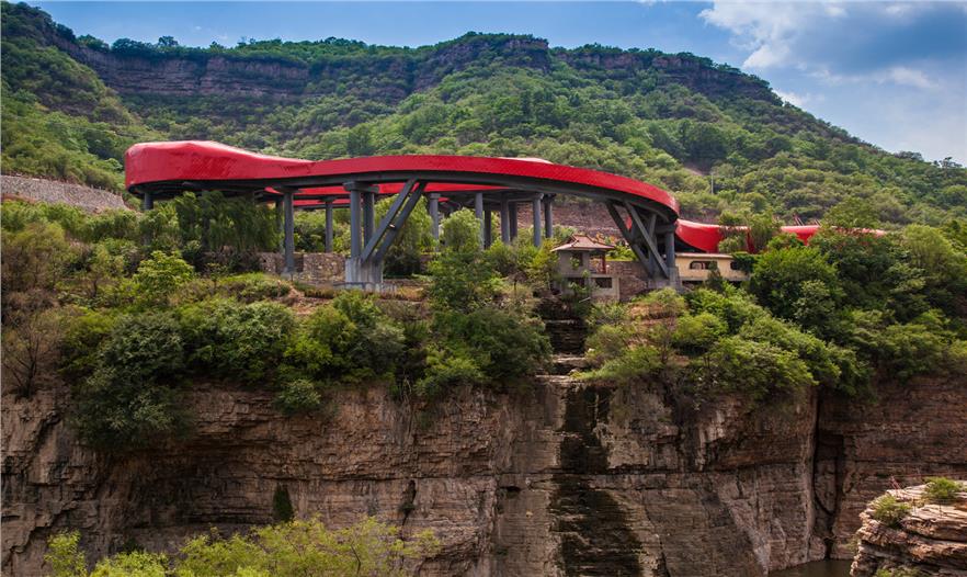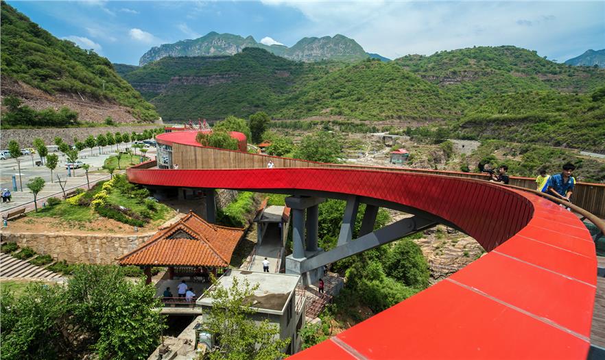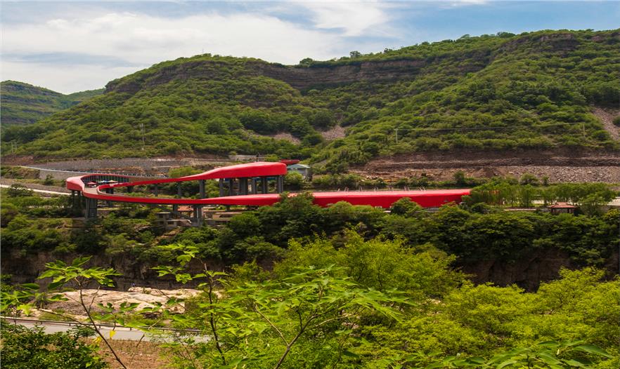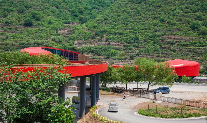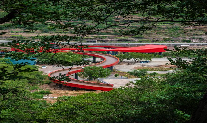 紅旗渠上的“太行天梯”用充滿豪情的紅色浪漫主義手法,在非常局促和復(fù)雜的地形中,用一條蜿蜒盤(pán)旋的空中步道,巧妙地解決了人流交通、車(chē)流組織、空間體驗(yàn)、科普教育和景觀保護(hù)等一系列挑戰(zhàn),用最少的干預(yù)和當(dāng)代的語(yǔ)言,在尊重紅旗渠偉大精神和壯麗景觀的同時(shí),闡釋了新世代的紅旗精神。