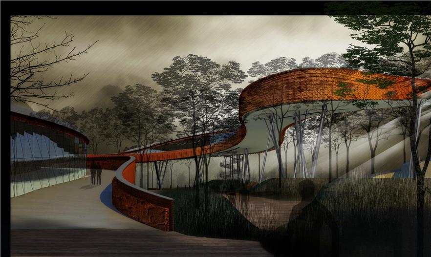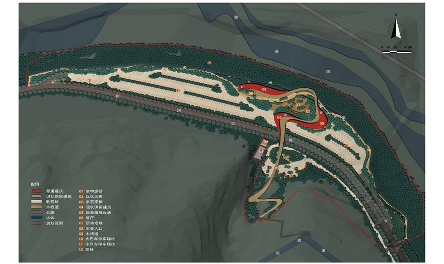 旅游接待及商業(yè)空間與線性步道融為一體,使得游客步行流線與對(duì)各建筑功能空間的使用更加清晰合理。