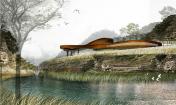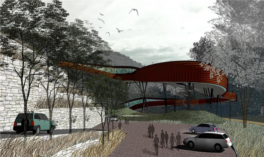 整個(gè)坡形建筑處于風(fēng)景區(qū)入口停車(chē)場(chǎng)之上,最大限度地留出有限的地面空間作為停車(chē)使用;同時(shí)坡形建筑橫跨了一條省級(jí)公路,使得進(jìn)入景區(qū)的流線得以與過(guò)境機(jī)動(dòng)車(chē)分離。