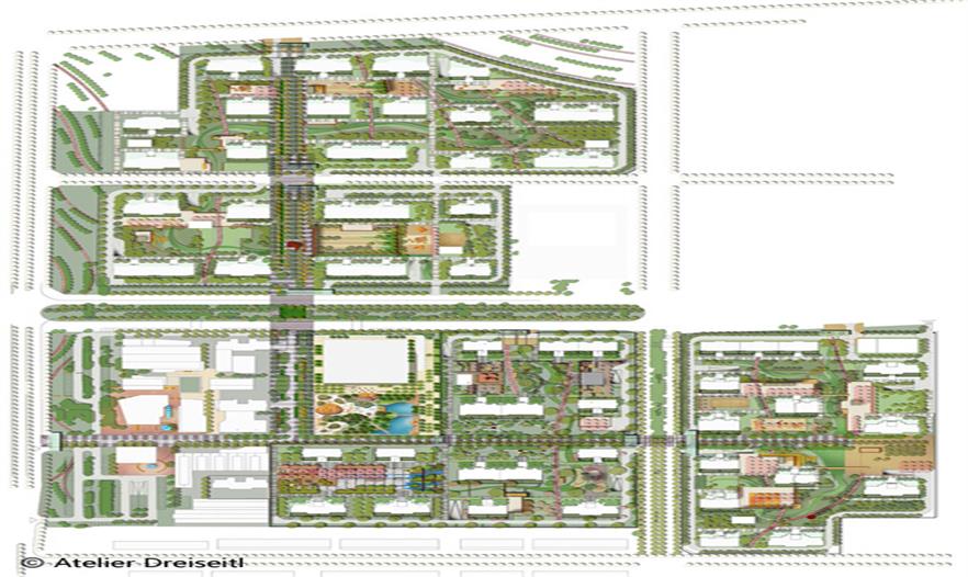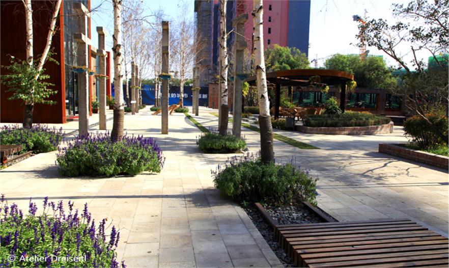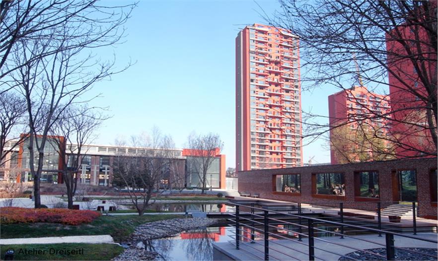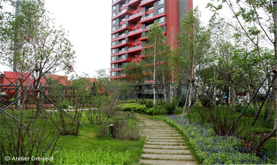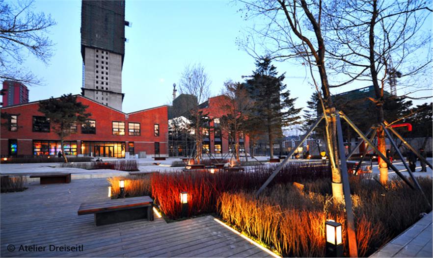Embedded in a picturesque landscape, shaped by wind and water, lies the 39-hectare project of Vanke Changchun in northern China. At the beginning of last century the plot was formed by the building of a huge diesel factory. In the 1920s several industrial buildings with brick facades were built, which were still in operation until 1990. As now a new mixed use was developed on that site, one of the most important questions was how this historic building structure could get integrated. First of all, analyzes of the building façade elements, foundations, towers, railway equipment and materials were undertaken to determine worth-while elements being preserved. After that a new plan was based on the existing geometric patterns that could match the requirements of use, density and character. Both concepts have been superimposed and a new district was developed, which is based on the existing industrial character of the relics. The open space concept with the large central park assimilates the elements of water, erosion and natural vegetation, and overlaid them with historic structures such as the old railroad tracks, but interpreted in a new design. Like a river, the park meanders through the strict grid and connects again scattered spaces and green oases. Meanwhile the first part of the residential estate is built (phase1: 5.9 ha.), e.g. the facade of the exhibition center with historic materials and techniques wall was rebuilt. The new high-rises with the historic structures are now a best seller and the further realization of the project is ongoing.