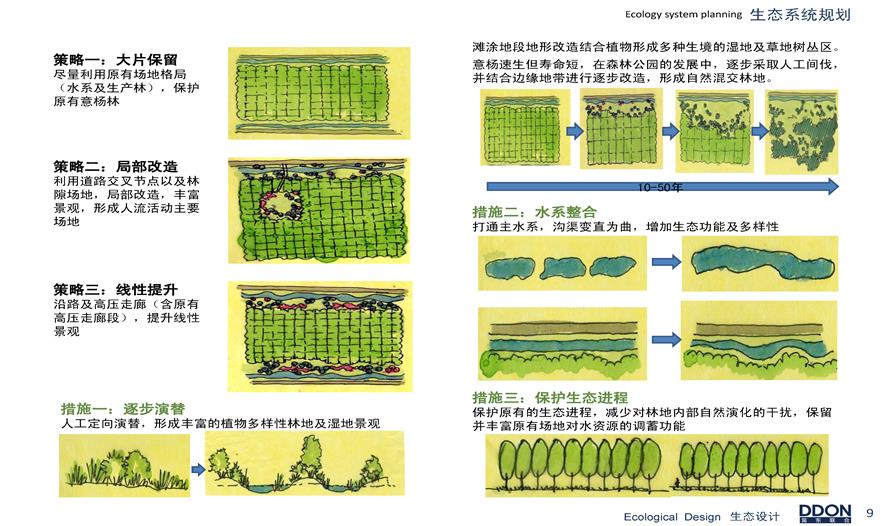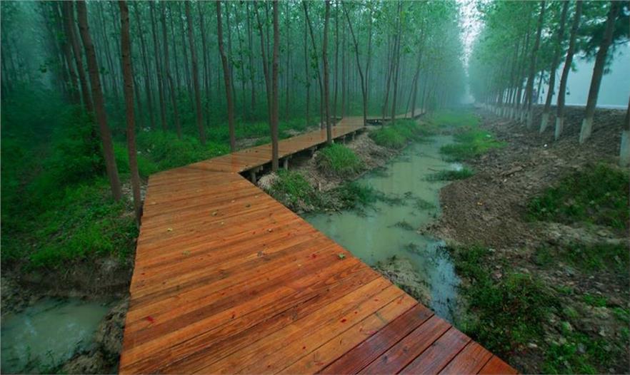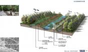 濱湖濕地森林公園的生態(tài)系統(tǒng)規(guī)劃設(shè)計(jì)是其重要亮點(diǎn),項(xiàng)目的生態(tài)規(guī)劃策略是利用原有場(chǎng)地格局保護(hù)意楊林。利用道路交叉節(jié)點(diǎn)及林隙場(chǎng)地局部改造,形成人流活動(dòng)場(chǎng)地。通過人工定向演替,形成豐富的植物多樣性林地及濕地景觀。灘涂地段地形改造結(jié)合植物形成多種生境的濕地及草地樹叢區(qū)。項(xiàng)目整體采用排澇灌溉和循環(huán)系統(tǒng)一體化設(shè)計(jì),濕地水循環(huán)主要是十五里河入巢湖處設(shè)節(jié)制閘,內(nèi)部單獨(dú)進(jìn)行水循環(huán)。森林水循環(huán)內(nèi)部在原有水渠基礎(chǔ)上整理形成外圍環(huán)型水渠,與原有東西向主渠形成日字型主循環(huán)系統(tǒng)。